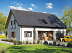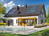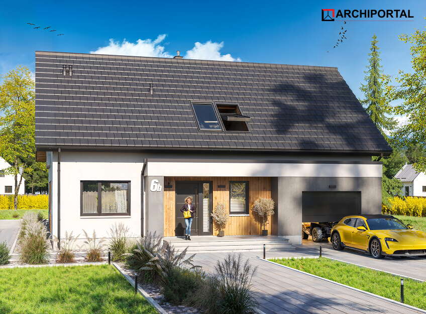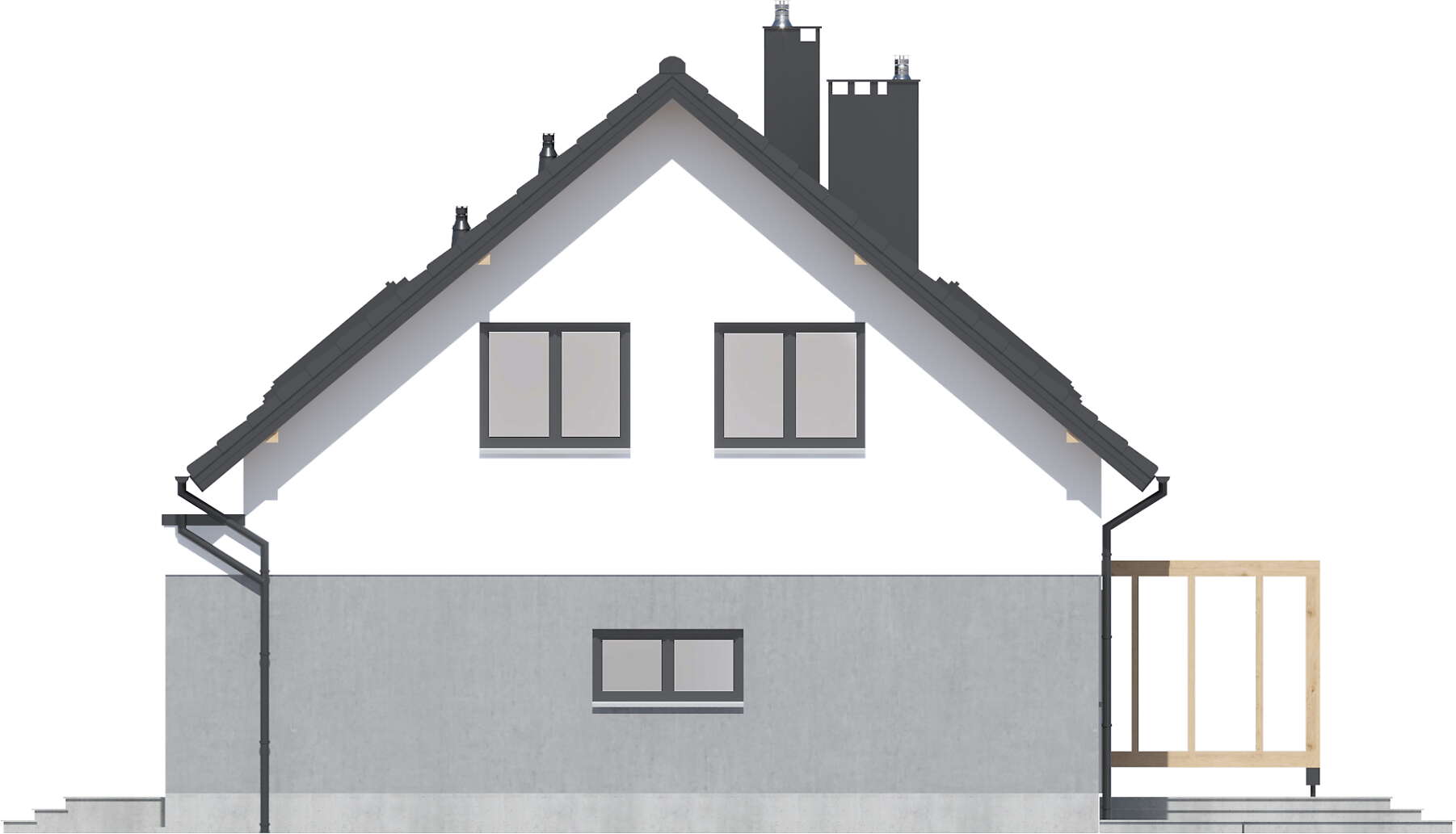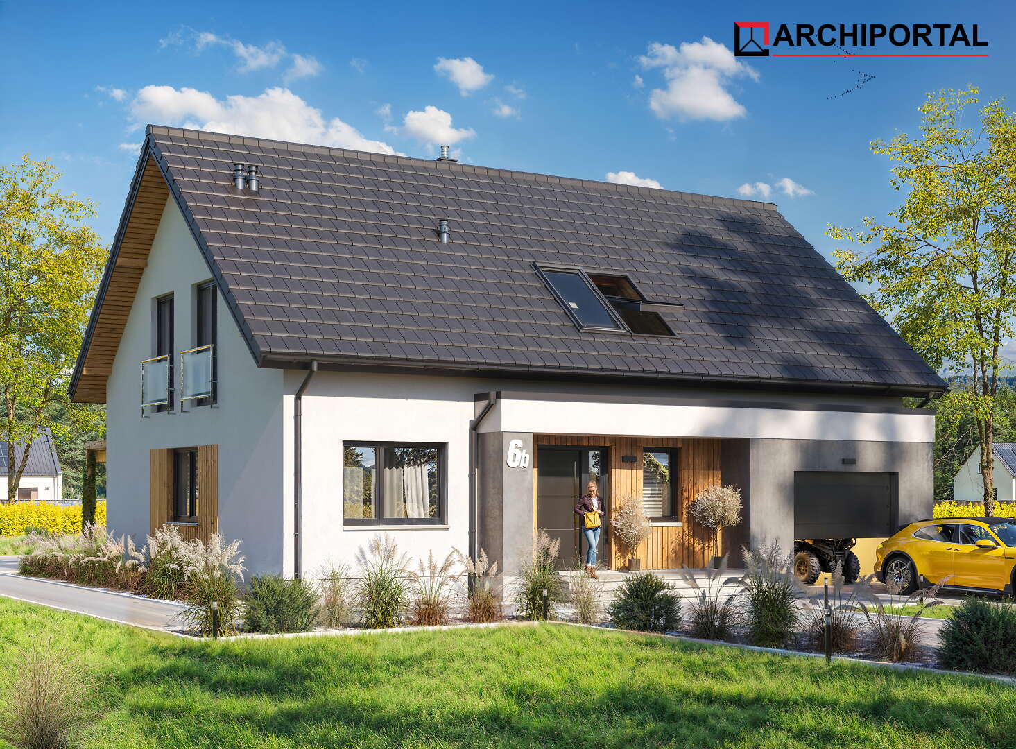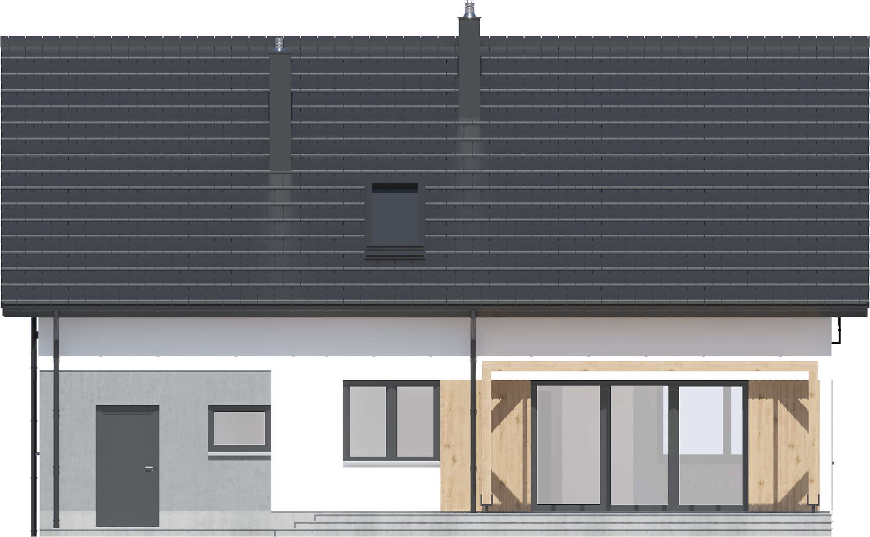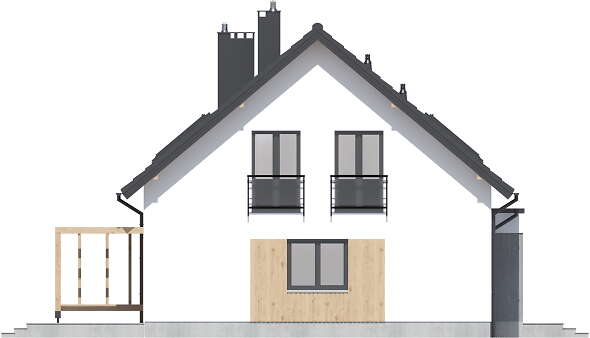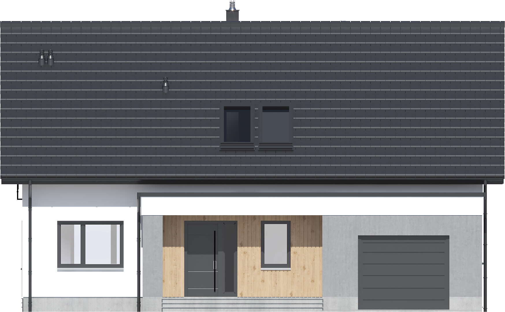 Dom ma nieskomplikowaną bryłę i prosty, dwuspadowy dach, co niewątpliwie będzie miało istotny wpływ na obniżenie kosztów budowy. Elewację budynku wykończono w nowoczesnym stylu, której biel kontrastuje z grafitowym kolorem stolarki i dachówki oraz modną okładziną drewnianą o ciepłym odcieniu.