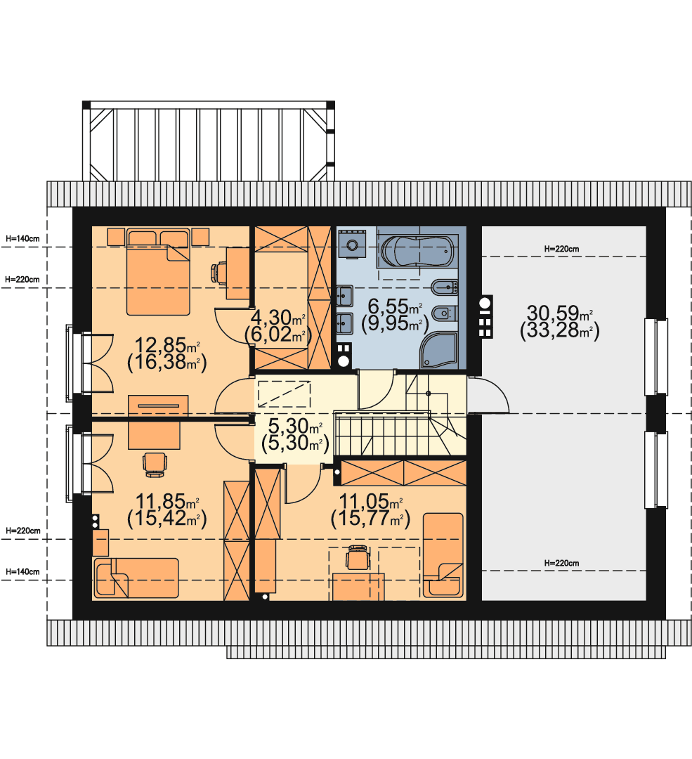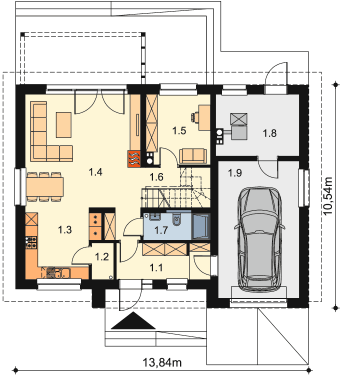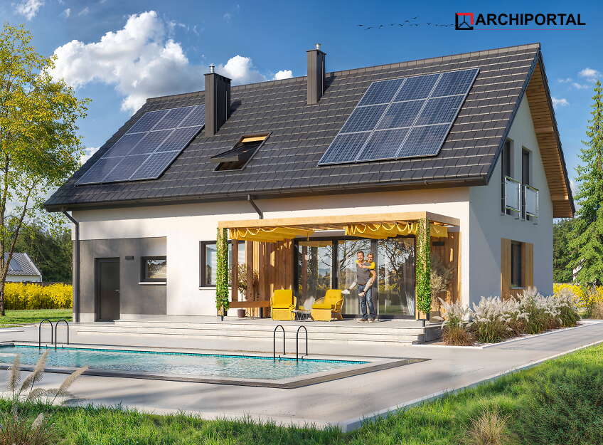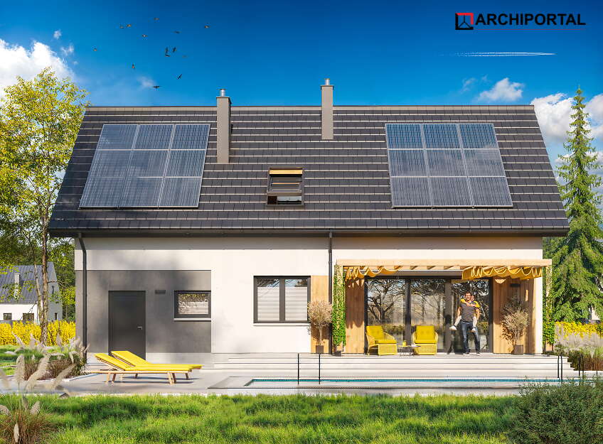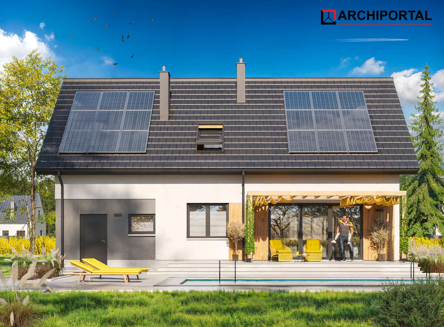 Projekt nowoczesnego domu z poddaszem użytkowym i wbudowanym garażem, który łączy w sobie funkcjonalność oraz nowoczesny design. Budynek ma do zaoferowania bardzo dużo przestrzeni. Na parterze znalazły się: spory wiatrołap, kuchnia, przestronny salon, praktyczna spiżarnia, łazienka, garaż, duża kotłownia oraz dodatkowy pokój, który można przeznaczyć np. na gabinet. W budynku zaprojektowano 2 rodzaje ogrzewania: piec na BIOMASĘ oraz POMPĘ CIEPŁA. Inwestor ma w ten sposób wybór i może zdecydować, które ogrzewania zastosować w swoim domu. Pakiet z pompą ciepła zawiera dodatkowo projekt ogrzewania podłogowego oraz projekt instalacji fotowoltaicznej. Na piętrze znajdują się trzy ustawne pokoje i duża łazienka z miejscem na wannę i prysznic. Główna sypialnia została połączona z przestronną garderobą, ze spocznika schodów dostaniemy się natomiast do pomieszczenia nad garażem, które może pełnić rolę strychu, miejsca zabaw lub po prostu dodatkowego pokoju.