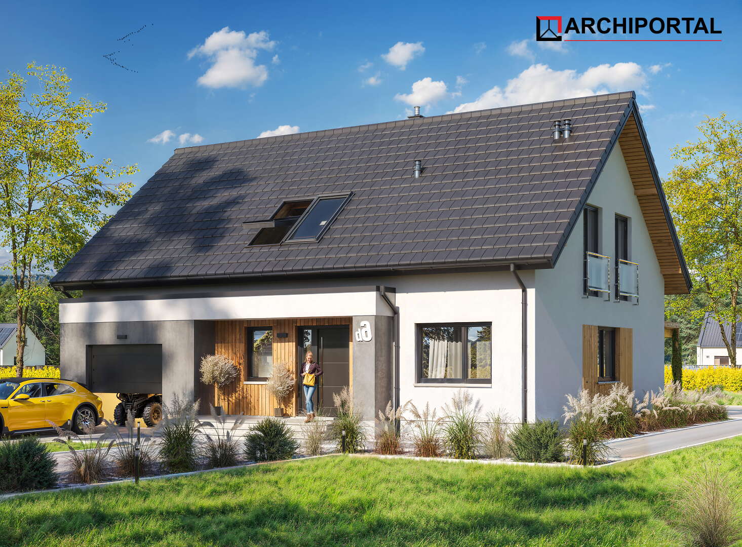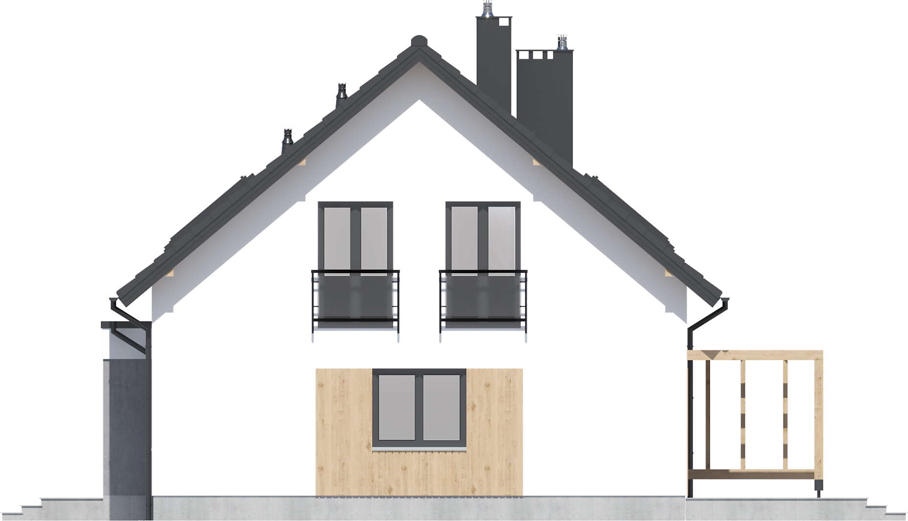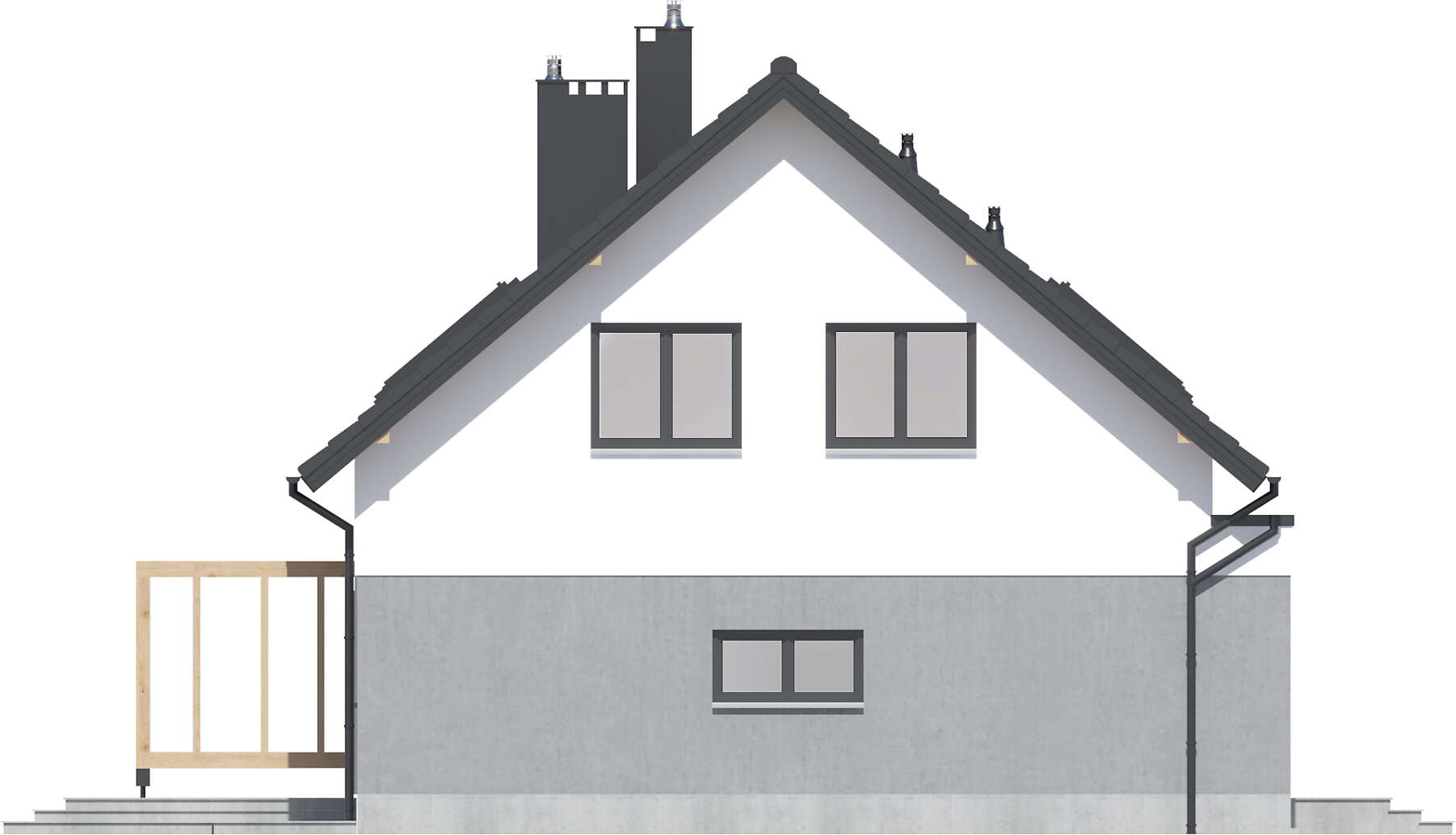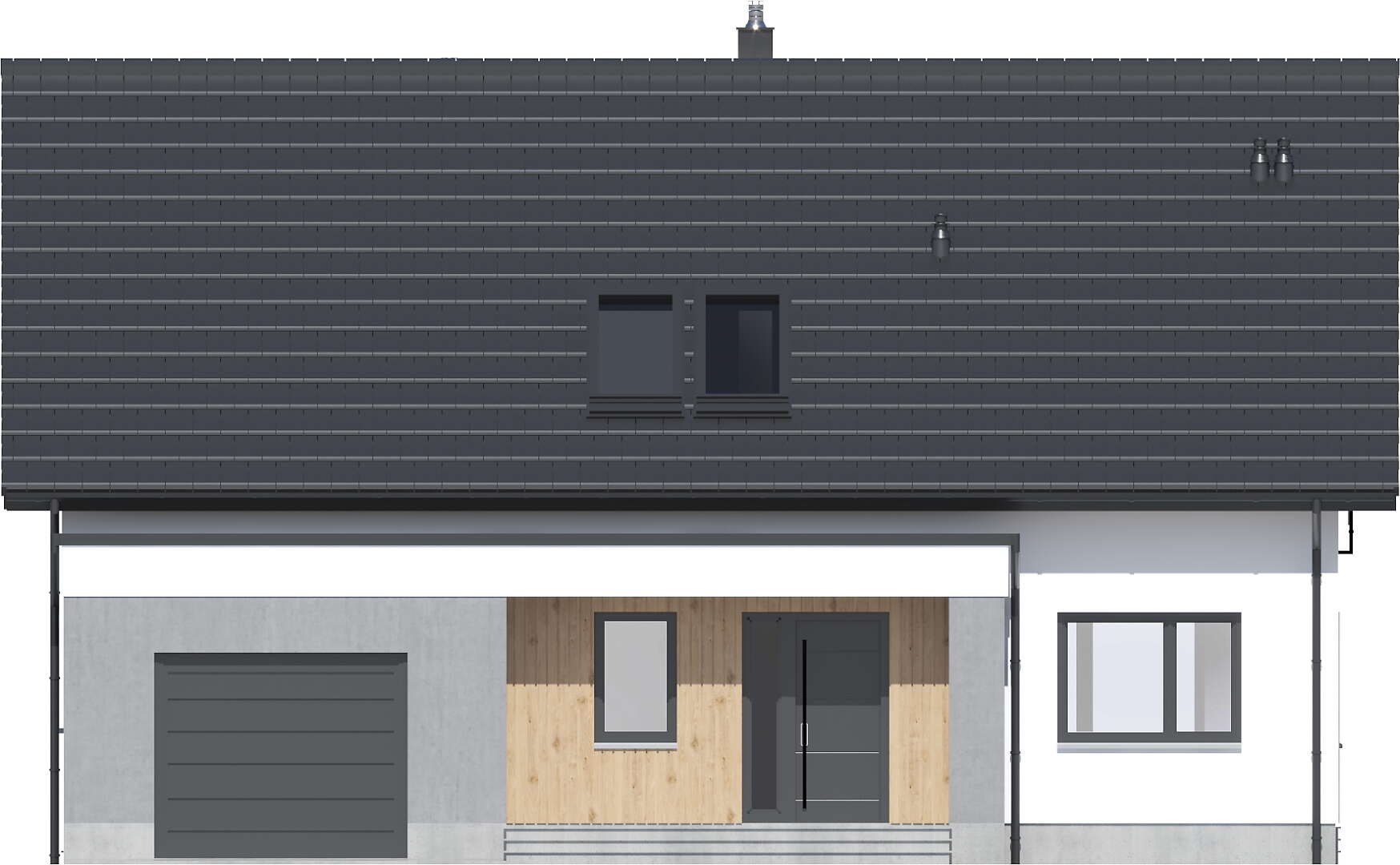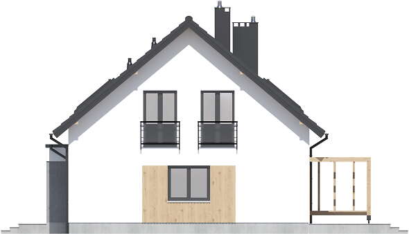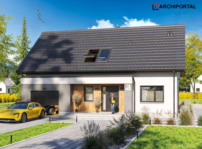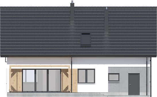 Dom ma nieskomplikowaną bryłę i prosty, dwuspadowy dach, co niewątpliwie będzie miało istotny wpływ na obniżenie kosztów budowy. Elewację budynku wykończono w nowoczesnym stylu, której biel kontrastuje z grafitowym kolorem stolarki i dachówki oraz modną okładziną drewnianą o ciepłym odcieniu.