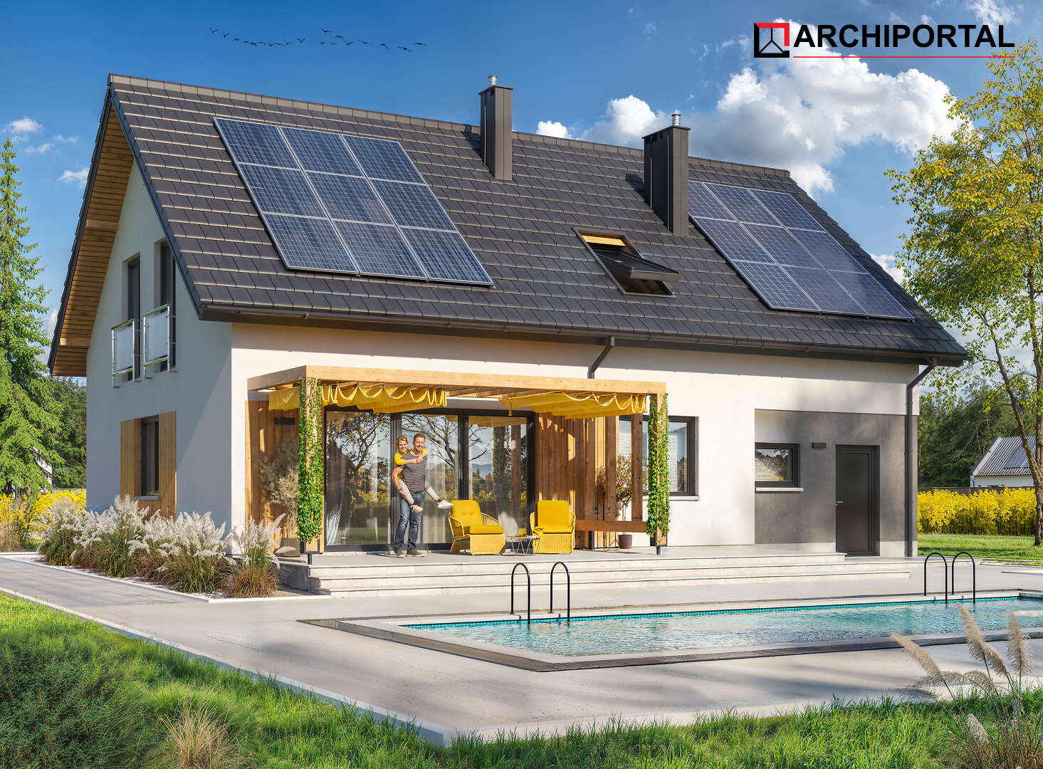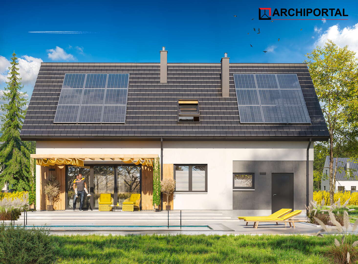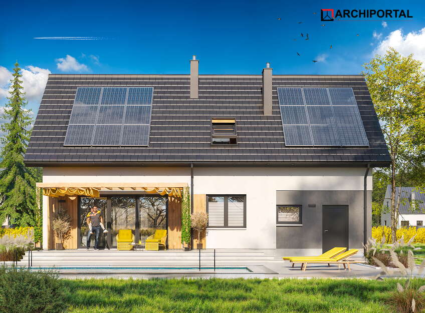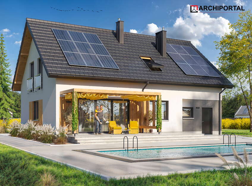 Projekty oznaczone tą ikonką posiadają zaprojektowane ogrzewanie przy pomocy pompy ciepła i ogrzewania podłogowego oraz gratisowy projekt instalacji fotowoltaicznej. Dodatkowo dokumentacja zawiera projekt ogrzewania na biomasę (pellet).