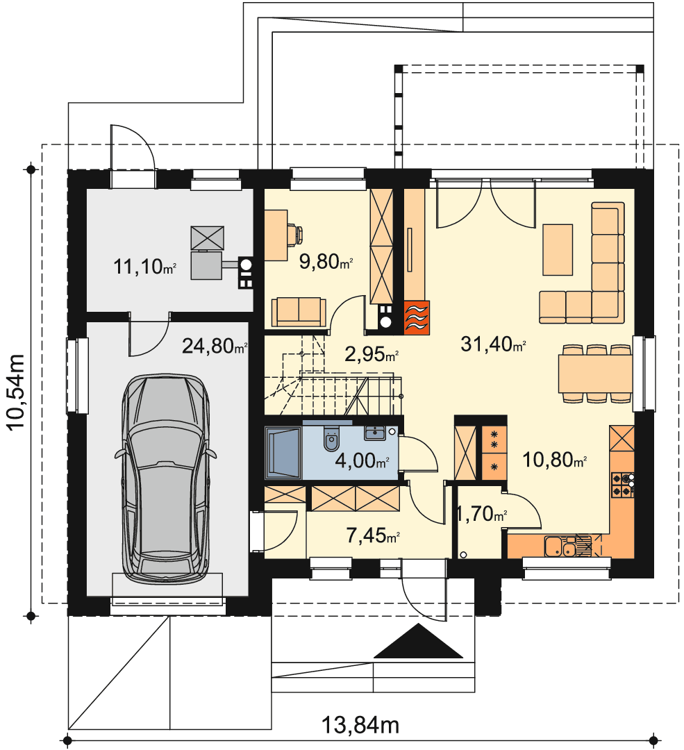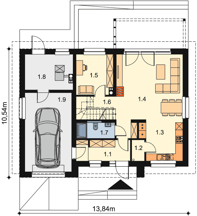 Projekt nowoczesnego domu z poddaszem użytkowym i wbudowanym garażem, który łączy w sobie funkcjonalność oraz nowoczesny design. Budynek ma do zaoferowania bardzo dużo przestrzeni. Na parterze znalazły się: spory wiatrołap, kuchnia, przestronny salon, praktyczna spiżarnia, łazienka, garaż, duża kotłownia oraz dodatkowy pokój, który można przeznaczyć np. na gabinet. W budynku zaprojektowano 2 rodzaje ogrzewania: piec na BIOMASĘ oraz POMPĘ CIEPŁA. Inwestor ma w ten sposób wybór i może zdecydować, które ogrzewania zastosować w swoim domu. Pakiet z pompą ciepła zawiera dodatkowo projekt ogrzewania podłogowego oraz projekt instalacji fotowoltaicznej. Na piętrze znajdują się trzy ustawne pokoje i duża łazienka z miejscem na wannę i prysznic. Główna sypialnia została połączona z przestronną garderobą, ze spocznika schodów dostaniemy się natomiast do pomieszczenia nad garażem, które może pełnić rolę strychu, miejsca zabaw lub po prostu dodatkowego pokoju.