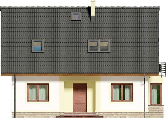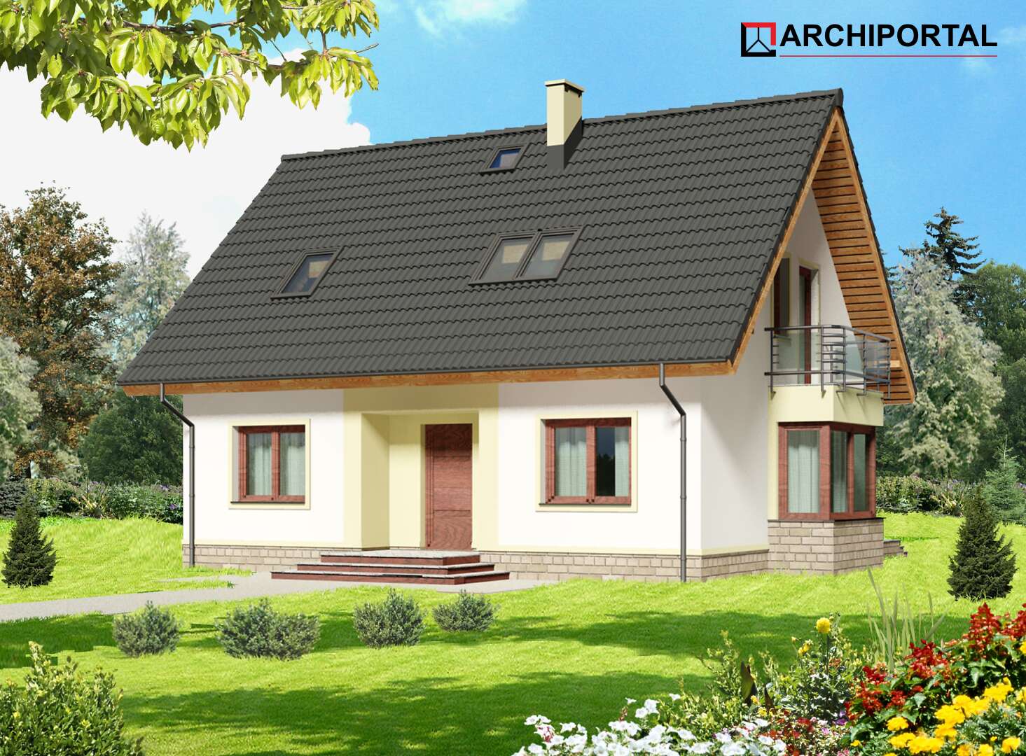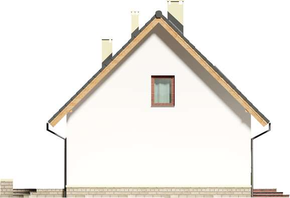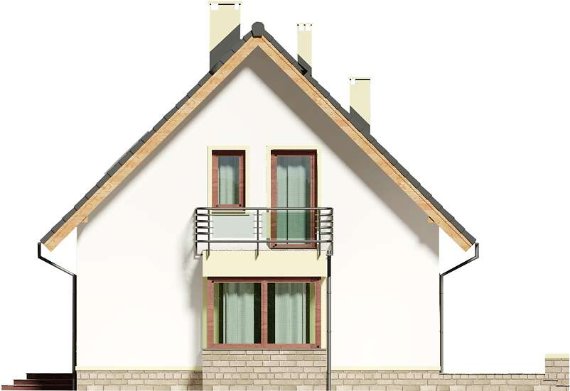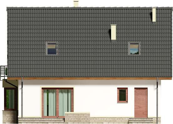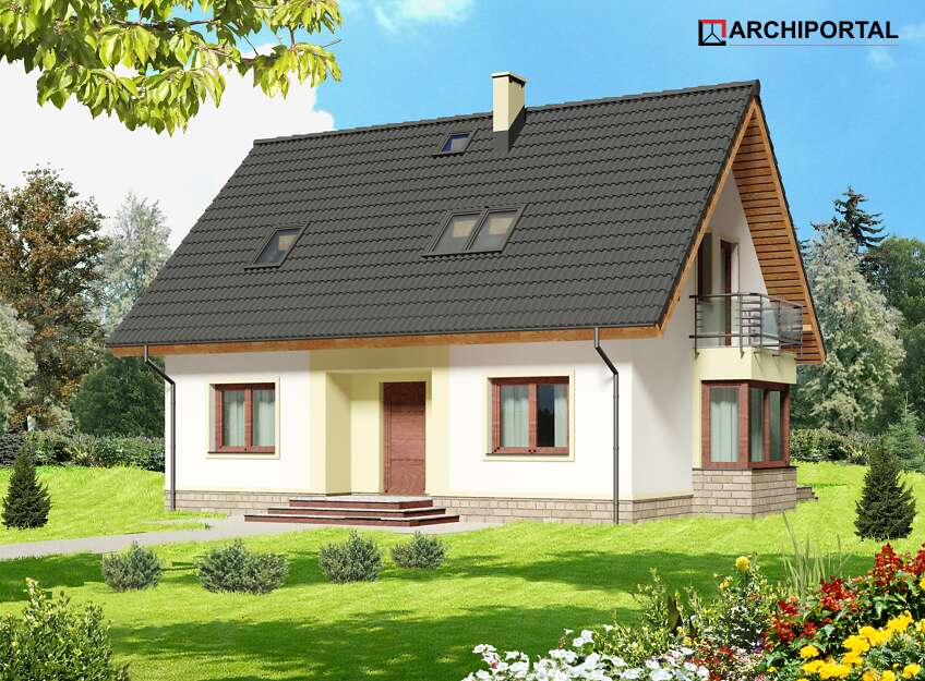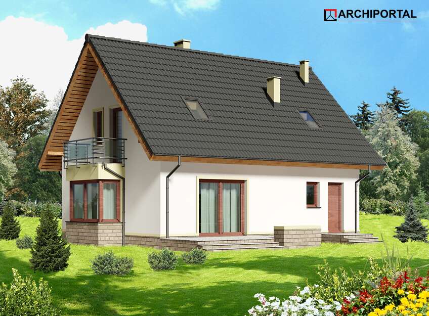 Klasyczny dom w nowoczesnej aranżacji. W projekcie zrezygnowano z tradycyjnej klatki schodowej powiększając powierzchnię salonu, co daje poczucie niezwykłej przestrzeni i komfortu, całość uzupełnia gustowny, przeszklony wykusz, w którym spożywanie posiłków będzie prawdziwą przyjemnością. Dodatkową zaletą parteru jest otwarta, nowoczesna kuchnia, praktyczna spiżarnia, duże pomieszczenie gospodarcze z bezpośrednim dostępem do ogrodu oraz dodatkowy pokój. Centralne położenie kominka doskonale sprawdza się podczas ogrzewania tego niewielkiego domku w długie, zimowe wieczory. Na piętrze znajdują się trzy ustawne pokoje, oraz duża łazienka z miejscem na wannę i prysznic. Dodatkowo, sypialnia rodziców ma własny balkon i połączona jest z dużą i jasną garderobą. Dzięki zaprojektowaniu schodów składanych w korytarzu mamy dostęp do stryszku nad piętrem. Dom ma nieskomplikowaną bryłę i prosty dach, dzięki czemu jest tani w budowie i późniejszej eksploatacji.