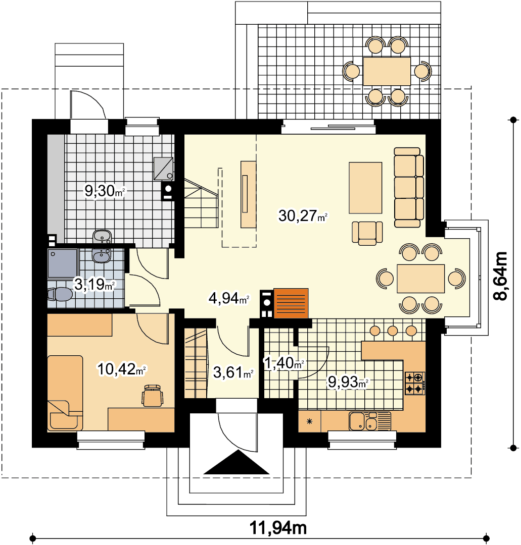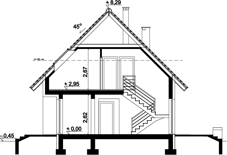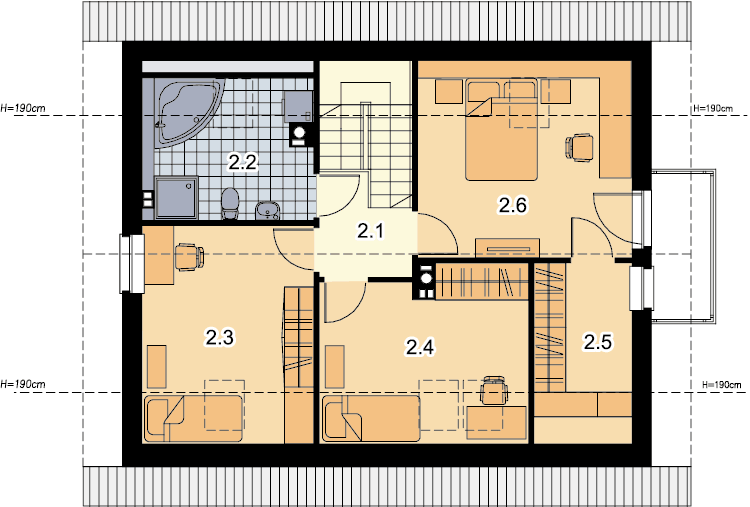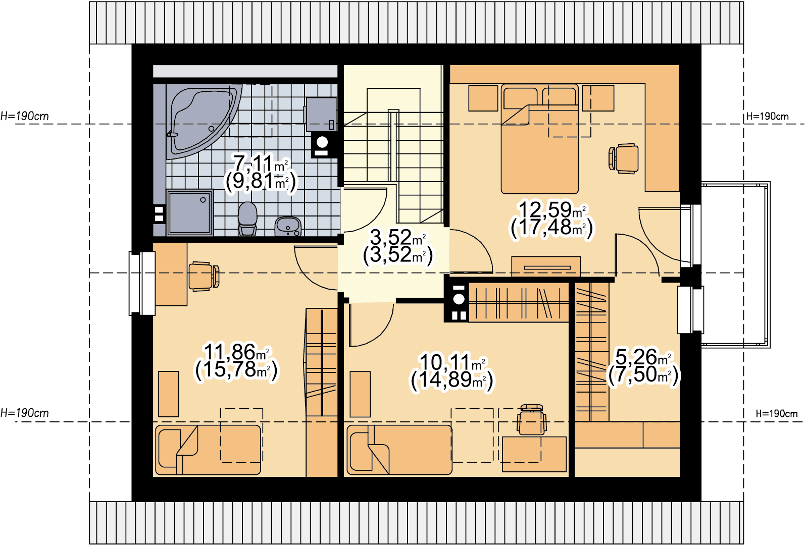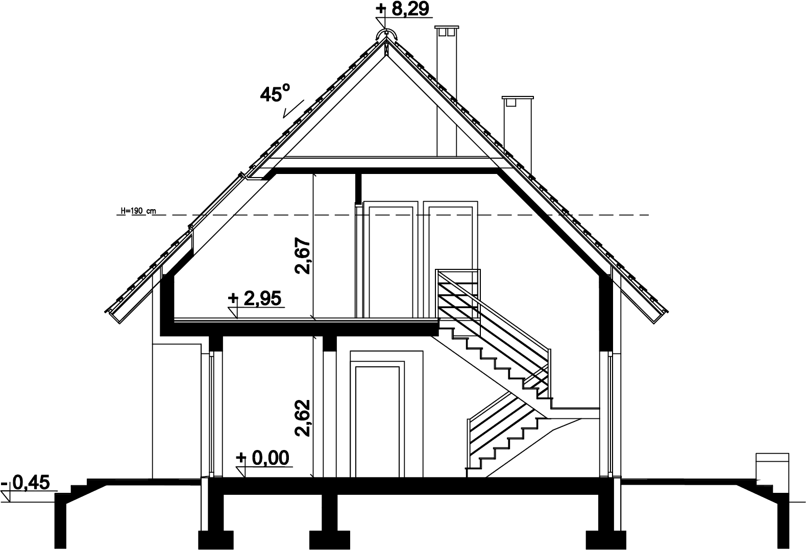 Klasyczny dom w nowoczesnej aranżacji. W projekcie zrezygnowano z tradycyjnej klatki schodowej powiększając powierzchnię salonu, co daje poczucie niezwykłej przestrzeni i komfortu, całość uzupełnia gustowny, przeszklony wykusz, w którym spożywanie posiłków będzie prawdziwą przyjemnością. Dodatkową zaletą parteru jest otwarta, nowoczesna kuchnia, praktyczna spiżarnia, duże pomieszczenie gospodarcze z bezpośrednim dostępem do ogrodu oraz dodatkowy pokój. Centralne położenie kominka doskonale sprawdza się podczas ogrzewania tego niewielkiego domku w długie, zimowe wieczory. Na piętrze znajdują się trzy ustawne pokoje, oraz duża łazienka z miejscem na wannę i prysznic. Dodatkowo, sypialnia rodziców ma własny balkon i połączona jest z dużą i jasną garderobą. Dzięki zaprojektowaniu schodów składanych w korytarzu mamy dostęp do stryszku nad piętrem. Dom ma nieskomplikowaną bryłę i prosty dach, dzięki czemu jest tani w budowie i późniejszej eksploatacji.