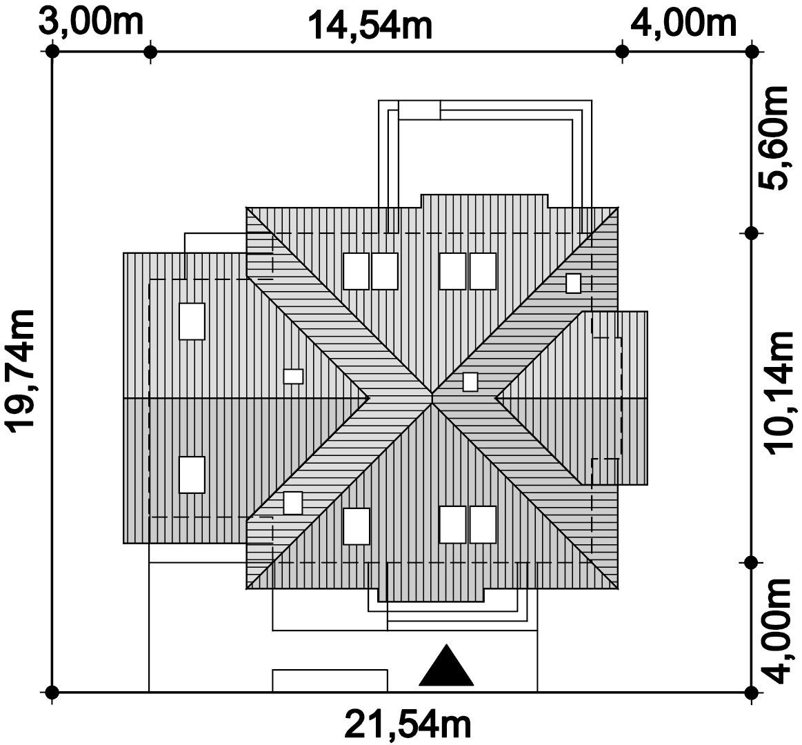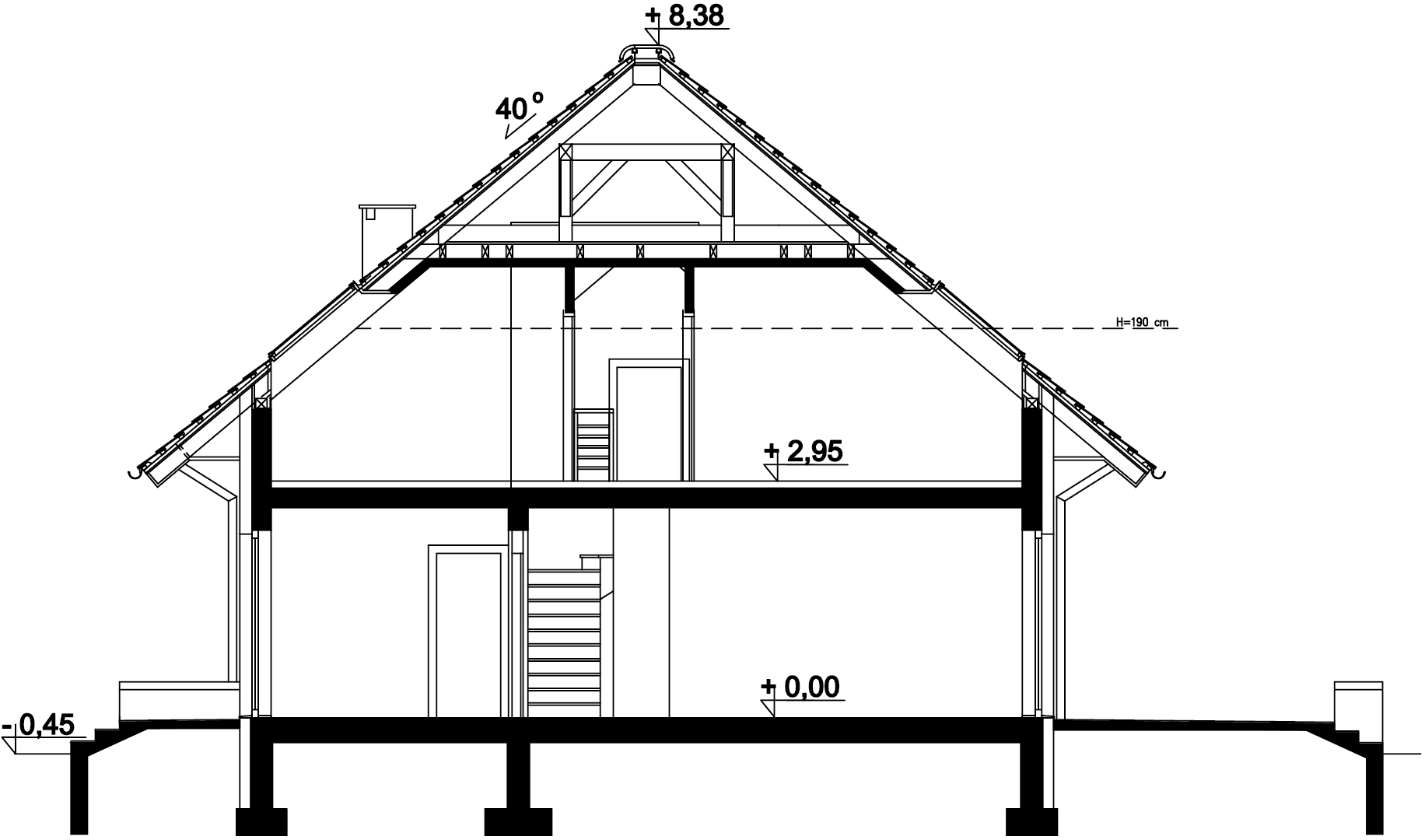 Projekt domu z poddaszem użytkowym, przeznaczony dla 4-5 osobowej rodziny. Do środka dostajemy się przez duży wiatrołap, otwierający się na resztę domu nowoczesnym przeszkleniem wejściowym. Na parterze znajduje się sporych rozmiarów salon z ciekawym wykuszem jadalnym, w którym spożywanie posiłków będzie prawdziwą przyjemnością. Pokój dzienny sąsiaduje bezpośrednio z otwartą kuchnią, którą w razie potrzeby można oddzielić ścianką działową. Zaprojektowano tu sporą spiżarnię, a na środku kuchni zmieści się bez trudu praktyczna wyspa. Do dyspozycji mieszkańców jest ponadto dodatkowy pokój z własną łazienką, który można przeznaczyć na sypialnię rodziców lub pokój seniora. Do garażu dostajemy się przez sporych rozmiarów kotłownię, w której bez trudu zmieścił się piec na paliwo stałe. Jednostanowiskowy garaż jest na tyle duży, że pomieści narzędzia ogrodowe lub dodatkowy opał. Poddasze to typowa strefa nocna, jest tu łazienka z miejscem na wannę i prysznic oraz aż 4 sypialnie. Jeden z pokojów, w razie potrzeby, można przeznaczyć na gabinet lub garderobę. Prawdziwą zaletą jest natomiast pomieszczenie nad garażem dostępne ze spocznika schodów, przykryto je dachem dwuspadowym, żeby powierzchnia użytkowa była jak największa. W ten sposób uzyskano dodatkowy pokój, który może pełnić rolę strychu, pralni, pokoju hobby lub kolejnej sypialni. Elewacja domu ma charakter nowoczesny z okładziną drewnianą, można ją jednak wykończyć w sposób tradycyjny.