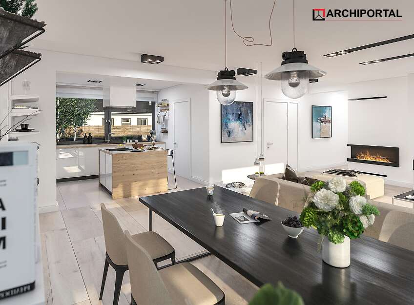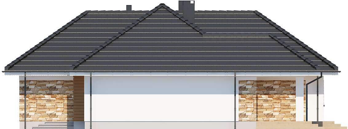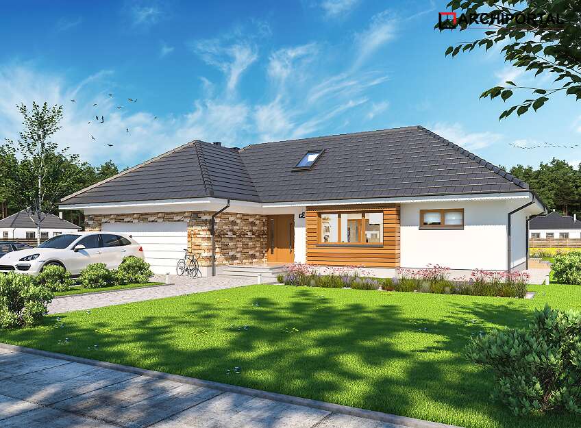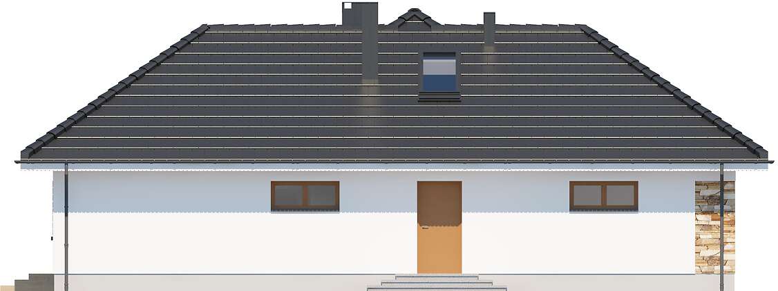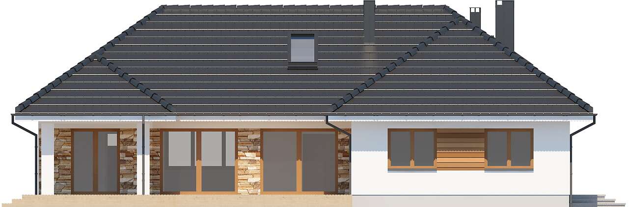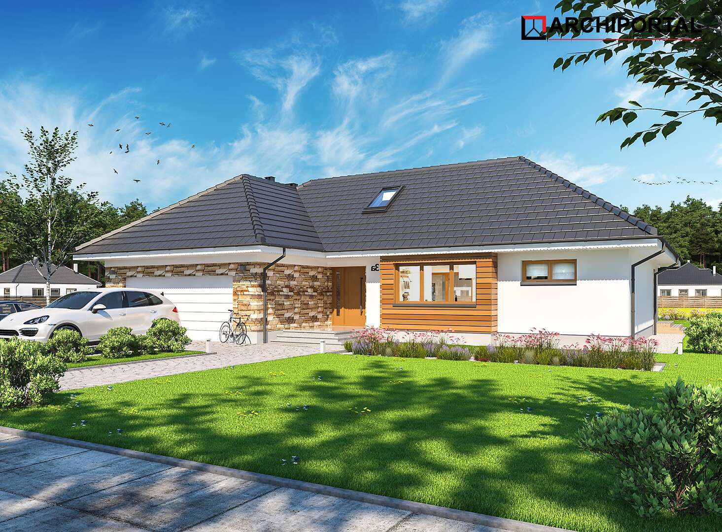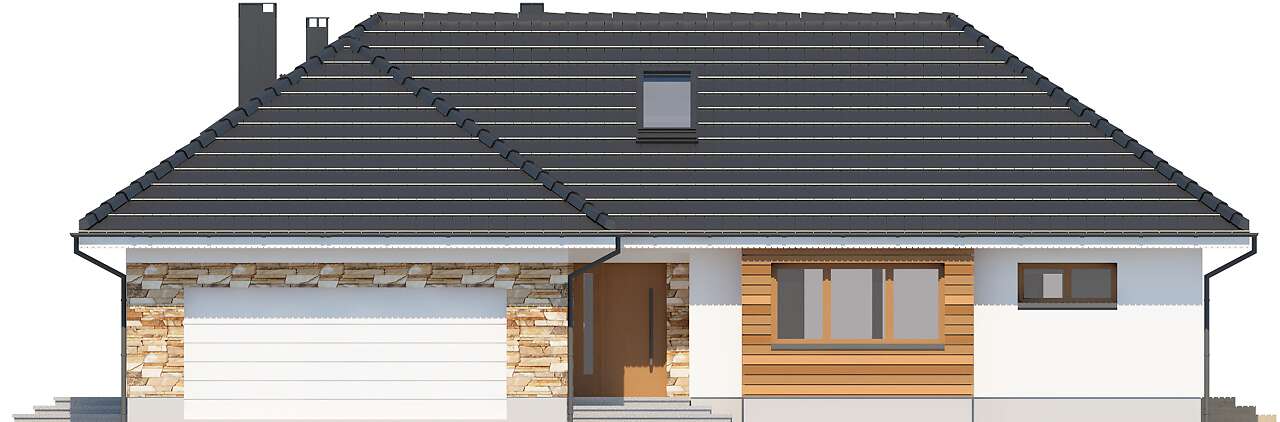Duży, luksusowy dom parterowy z możliwością adaptacji poddasza. Do środka dostajemy się przez wiatrołap, z którego jest dostęp do dużego, dwustanowiskowego garażu. Bezpośrednio z wiatrołapu wchodzimy do ogromnego salonu, w którym wydzielono strefę wypoczynkową, a także miejsce na długi, rodzinny stół, przy którym spożywanie posiłków będzie prawdziwą przyjemnością, a wysokie okna tarasowe zapewnią maksimum oświetlenia o każdej porze roku.