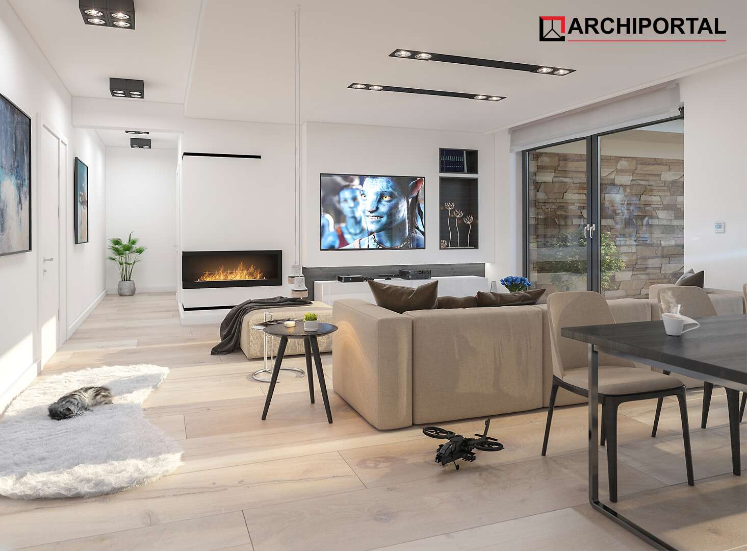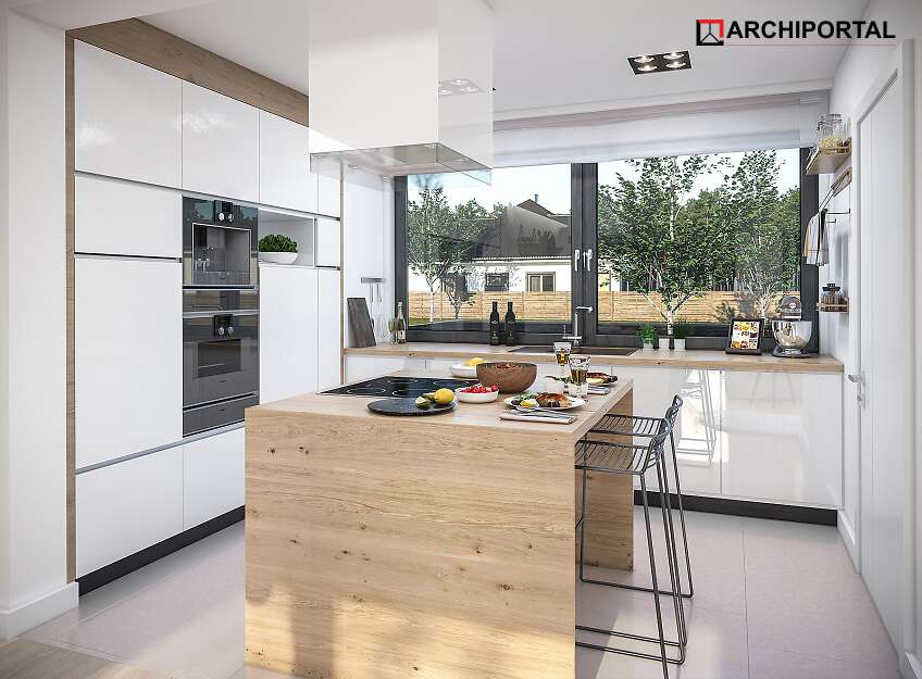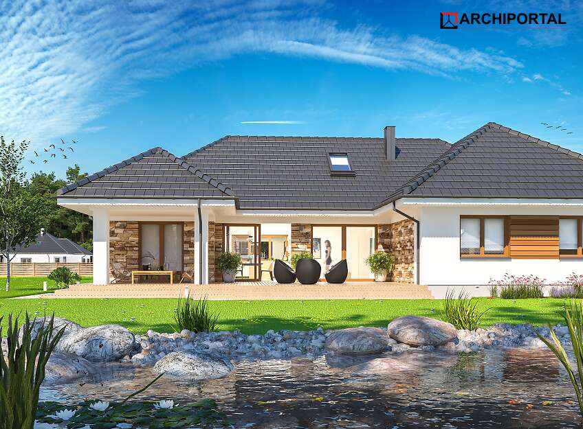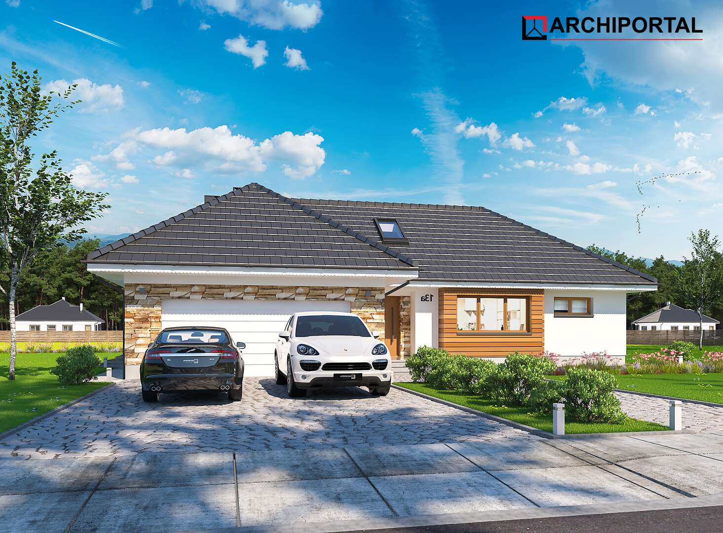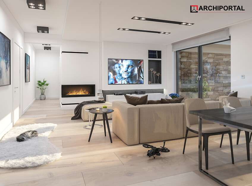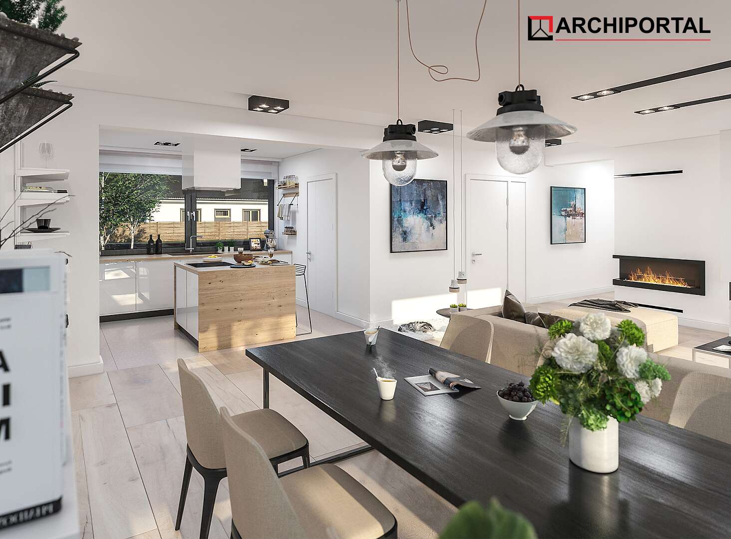 Duży, luksusowy dom parterowy z możliwością adaptacji poddasza. Do środka dostajemy się przez wiatrołap, z którego jest dostęp do dużego, dwustanowiskowego garażu. Bezpośrednio z wiatrołapu wchodzimy do ogromnego salonu, w którym wydzielono strefę wypoczynkową, a także miejsce na długi, rodzinny stół, przy którym spożywanie posiłków będzie prawdziwą przyjemnością, a wysokie okna tarasowe zapewnią maksimum oświetlenia o każdej porze roku.
