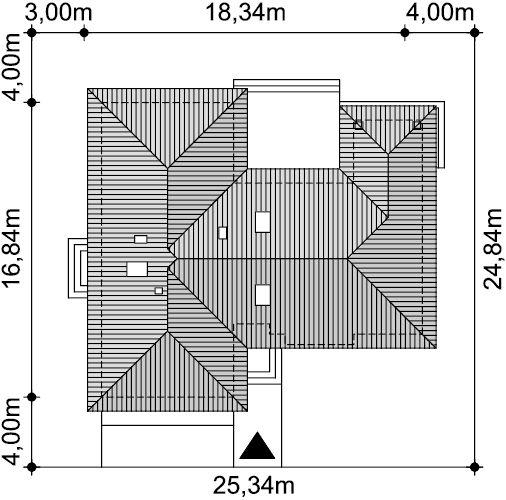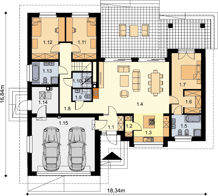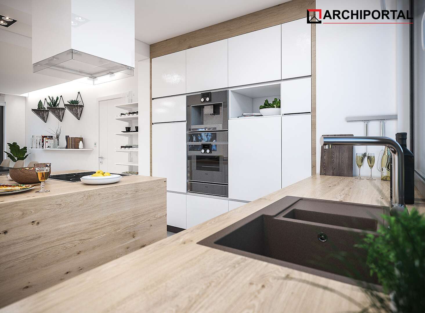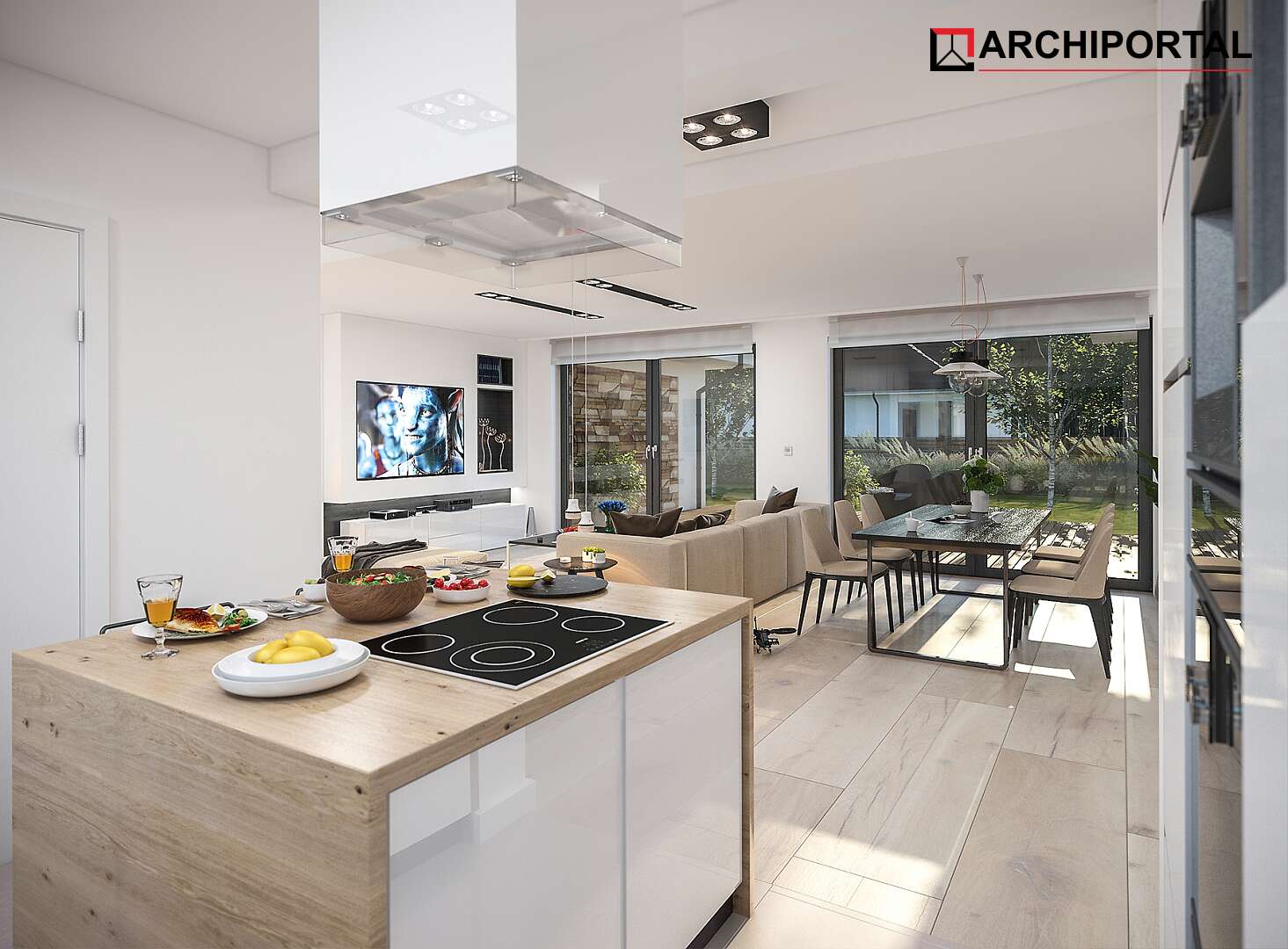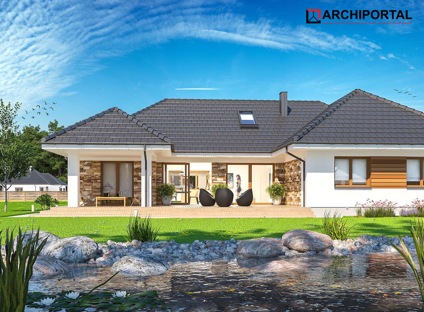 Duży, luksusowy dom parterowy z możliwością adaptacji poddasza. Do środka dostajemy się przez wiatrołap, z którego jest dostęp do dużego, dwustanowiskowego garażu. Bezpośrednio z wiatrołapu wchodzimy do ogromnego salonu, w którym wydzielono strefę wypoczynkową, a także miejsce na długi, rodzinny stół, przy którym spożywanie posiłków będzie prawdziwą przyjemnością, a wysokie okna tarasowe zapewnią maksimum oświetlenia o każdej porze roku.
