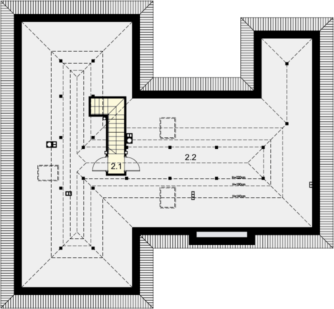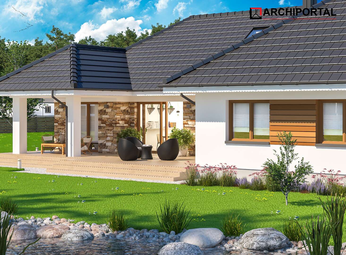 Pozostała część domu to typowa strefa nocna, ogromną zaletą jest to, że główna sypialnia znajduje się z jednej strony budynku, a pozostałe pokoje znalazły się w jego drugiej części. Sypialnia rodziców posiada własną, odrębną garderobę i dużą łazienkę. Z pokoju wyjdziemy bezpośrednio na ogród poprzez zadaszony taras. Poza pokojami w drugiej części budynku, do dyspozycji mieszkańców jest jeszcze łazienka, pralnia i toaleta. Są tutaj także schody prowadzące na poddasze nieużytkowe. W ten sposób uzyskujemy dostęp do dużej, dodatkowej powierzchni, którą można przeznaczyć na strych, pokój hobby, pracownię, studio lub dodatkowe pokoje mieszkalne. Rodzaj stropu umożliwią dowolną aranżację tej przestrzeni, z doprojektowaniem dodatkowej łazienki włącznie.