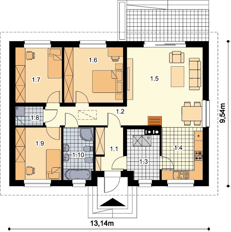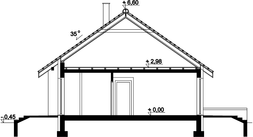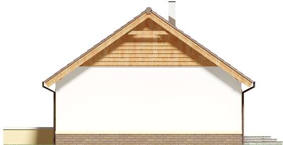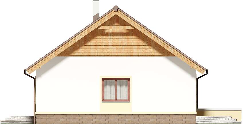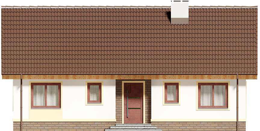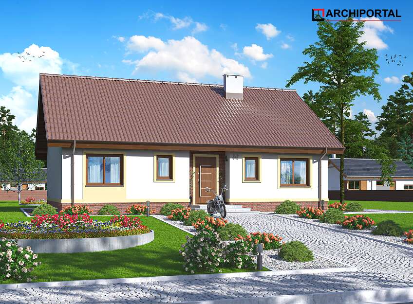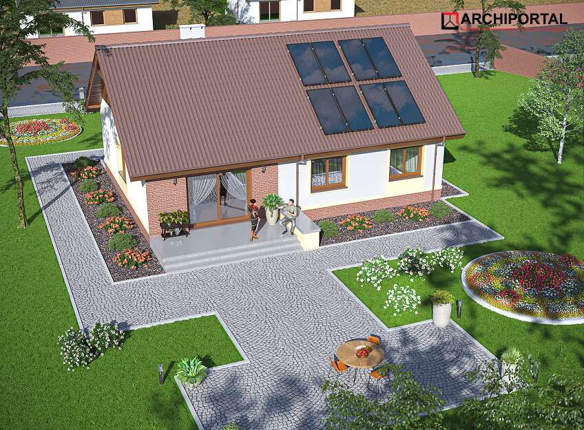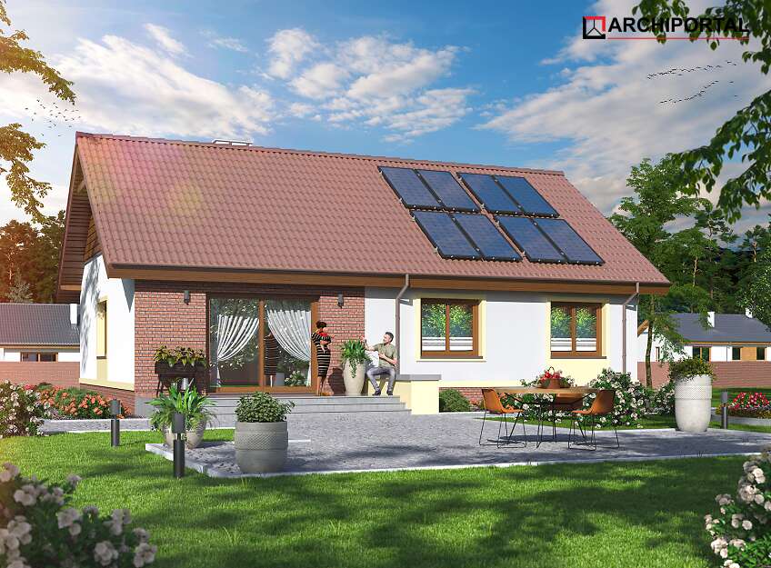 Dom parterowy przeznaczony dla 3-4 osobowej rodziny. W ciągu dnia mieszkańcy mogą się relaksować w przestronnym, dobrze oświetlonym salonie, połączonym z otwartą kuchnią. W jej sąsiedztwie znajduje się duża kotłownia z bezpośrednim dostępem zarówno z kuchni jaki i wiatrołapu. Dzięki temu może ona pełnić również rolę spiżarni. Centralne usytuowania kominka ułatwi ogrzewanie domu zimą. Do dyspozycji domowników są jeszcze 3 ustawne pokoje i łazienka, w której zmieści się wanna i prysznic. W głównej sypialni przewidziano miejsce na ciąg szaf przesuwnych. Nie zapomniano również o praktycznej pralni, którą w razie potrzeby można zaadaptować na schowek lub garderobę. W korytarzu przewidziano schody składane, umożliwiające dostęp na sporych rozmiarów strych. W domu zaprojektowano dwa rodzaje ogrzewania: GAZOWE oraz na PALIWO STAŁE. Od przyszłego inwestora zależy, które z nich wykorzysta. Dom ma prostą bryłę i nieskomplikowany dach, dzięki czemu jest tani w budowie i późniejszej eksploatacji. Budynek zaprojektowano w oparciu o najnowsze przepisy prawa budowlanego, z dużą dbałością o jego wpływ na środowisko naturalne.