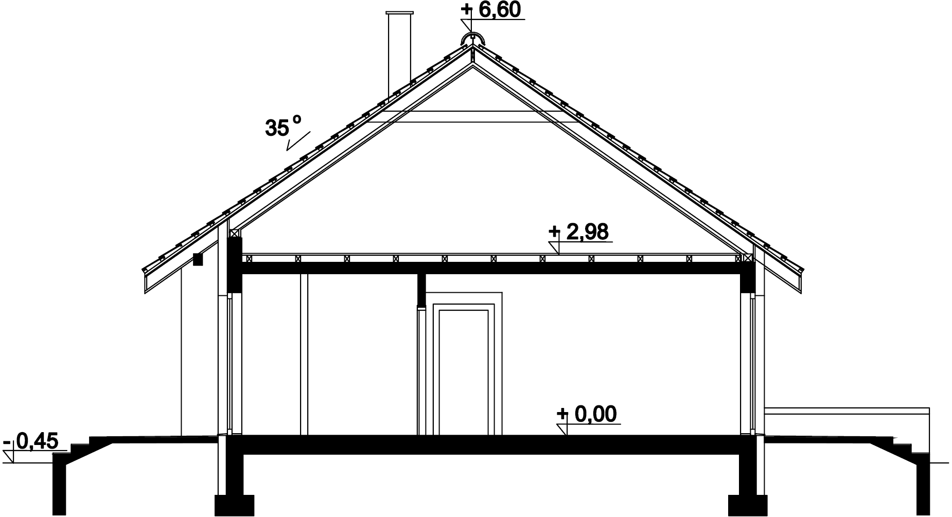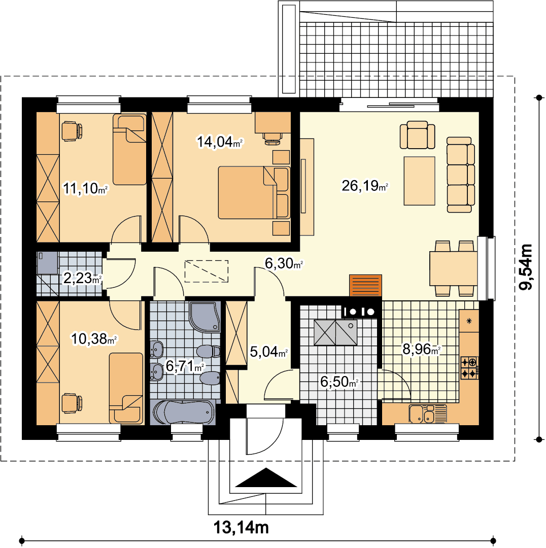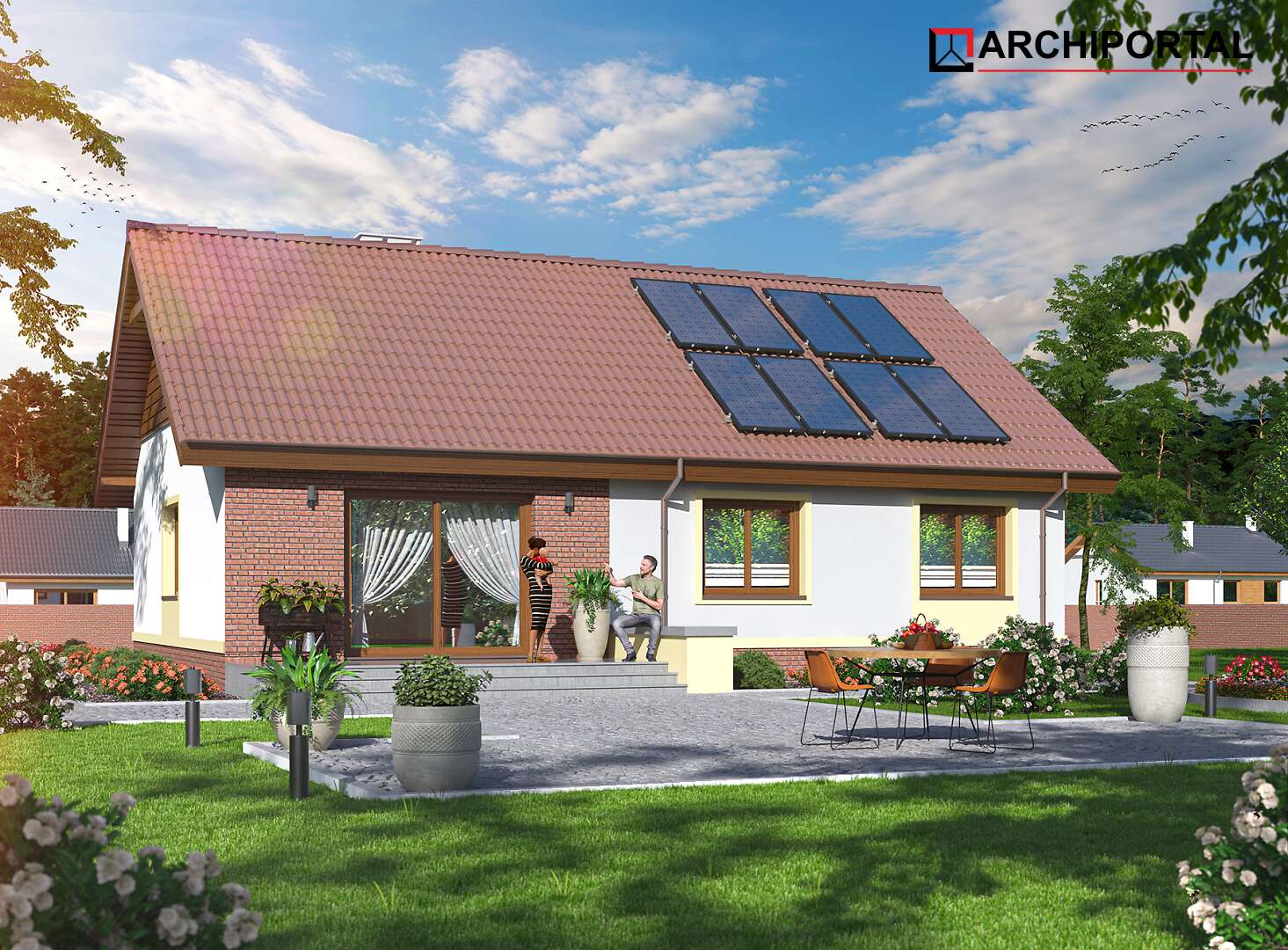 Dom parterowy przeznaczony dla 3-4 osobowej rodziny. W ciągu dnia mieszkańcy mogą się relaksować w przestronnym, dobrze oświetlonym salonie, połączonym z otwartą kuchnią. W jej sąsiedztwie znajduje się duża kotłownia z bezpośrednim dostępem zarówno z kuchni jaki i wiatrołapu. Dzięki temu może ona pełnić również rolę spiżarni. Centralne usytuowania kominka ułatwi ogrzewanie domu zimą. Do dyspozycji domowników są jeszcze 3 ustawne pokoje i łazienka, w której zmieści się wanna i prysznic. W głównej sypialni przewidziano miejsce na ciąg szaf przesuwnych. Nie zapomniano również o praktycznej pralni, którą w razie potrzeby można zaadaptować na schowek lub garderobę. W korytarzu przewidziano schody składane, umożliwiające dostęp na sporych rozmiarów strych. W domu zaprojektowano dwa rodzaje ogrzewania: GAZOWE oraz na PALIWO STAŁE. Od przyszłego inwestora zależy, które z nich wykorzysta. Dom ma prostą bryłę i nieskomplikowany dach, dzięki czemu jest tani w budowie i późniejszej eksploatacji. Budynek zaprojektowano w oparciu o najnowsze przepisy prawa budowlanego, z dużą dbałością o jego wpływ na środowisko naturalne.