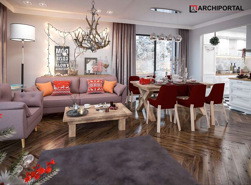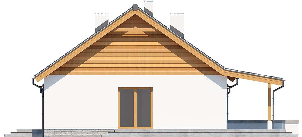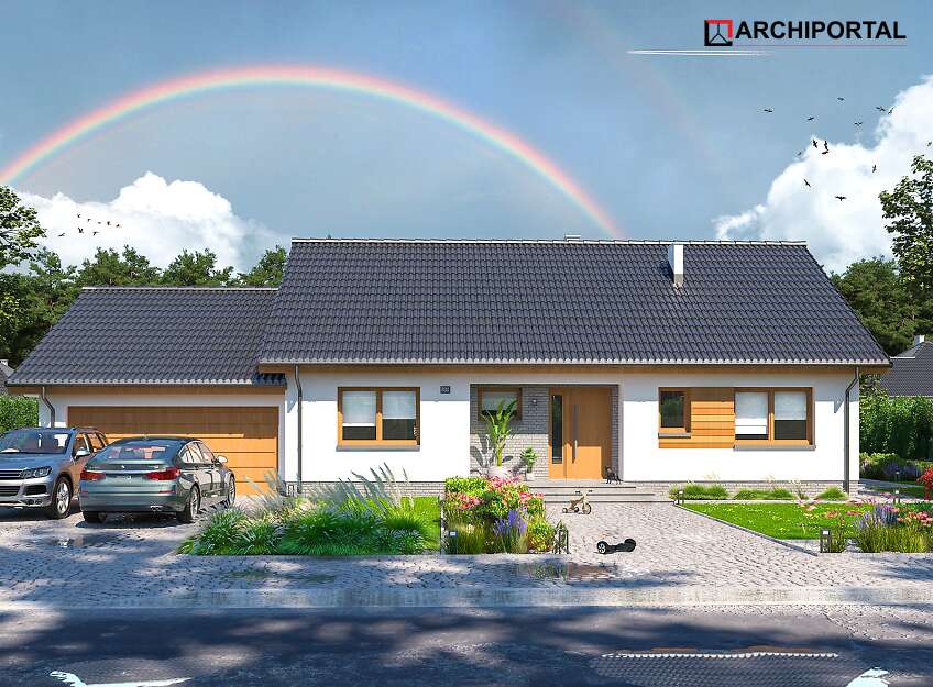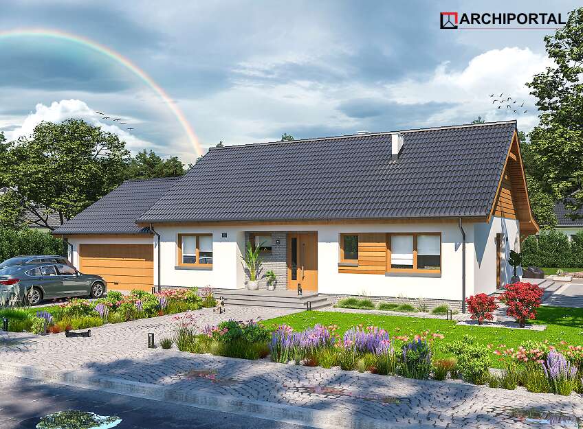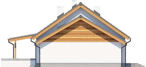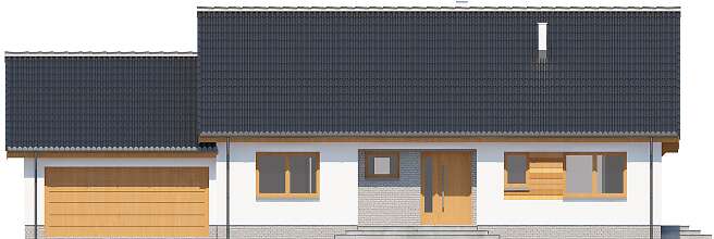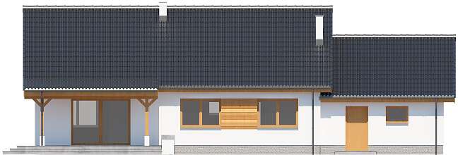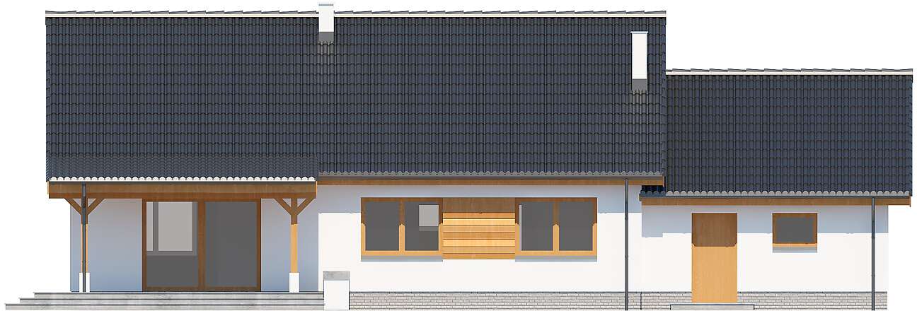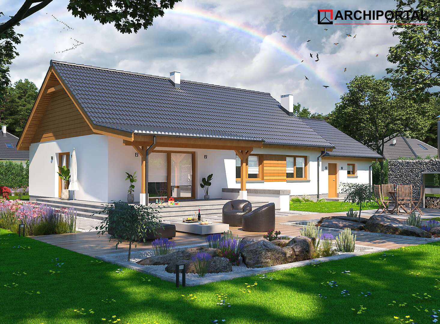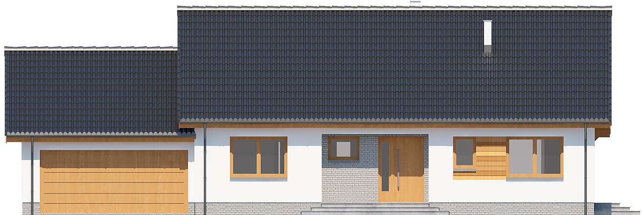 Klasyczny dom parterowy charakteryzujący się prostą formą i nieskomplikowanym dachem, co korzystnie wpływa na oszczędności związane z jego budową oraz późniejszą eksploatacją. Elementy drewniane na elewacji zapewniają mu nowoczesny wygląd, a zadaszony taras z pewnością będzie miejscem odpoczynku i relaksu. W ciągu dnia domownicy mają do dyspozycji duży, dobrze oświetlony salon, połączony z jadalnią. Z pokoju dziennego do ogrodu możemy dostać się przez duże drzwi tarasowe, jak również przez drzwi z boku budynku. Jadalnia płynnie przechodzi w kuchnię, którą po dostawieniu ścianki można przekształcić w zamknięte pomieszczenie. Nie zapomniano również o praktycznej spiżarni i dodatkowej toalecie, dostępnej z wiatrołapu. Część nocna to trzy ustawne pokoje oraz łazienka z miejscem na wannę i prysznic. Do garażu dostajemy się przez pomieszczenie gospodarcze, które może pełnić rolę pralni. Za garażem znajduje się duża kotłownia z wyjściem na zewnątrz. W domu zaprojektowano dwa rodzaje ogrzewania: GAZOWE oraz na PALIWO STAŁE. Od przyszłego inwestora zależy, które z nich wykorzysta w swoim domu. Konstrukcja dachu została zaprojektowana w postaci gotowych wiązarów, będzie to miało niewątpliwy wpływ na szybkość budowy, ale co najważniejsze na niski poziom kosztów. Dodatkowo w budynku zrezygnowano z niektórych ścian nośnych, dzięki takiemu rozwiązaniu przestrzeń może być aranżowana praktycznie w dowolny sposób.