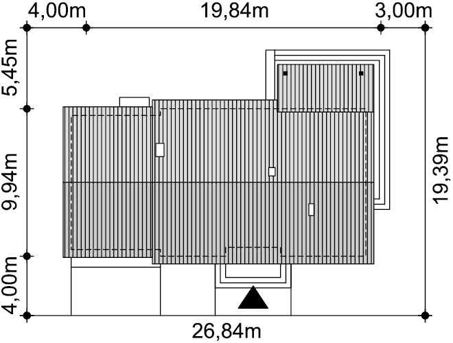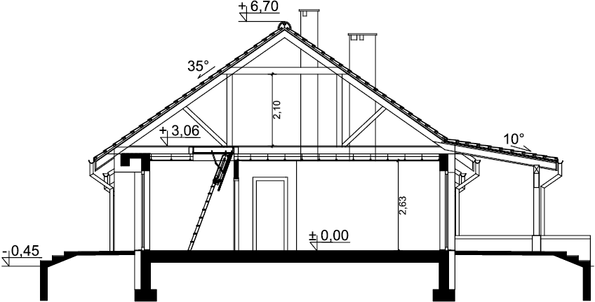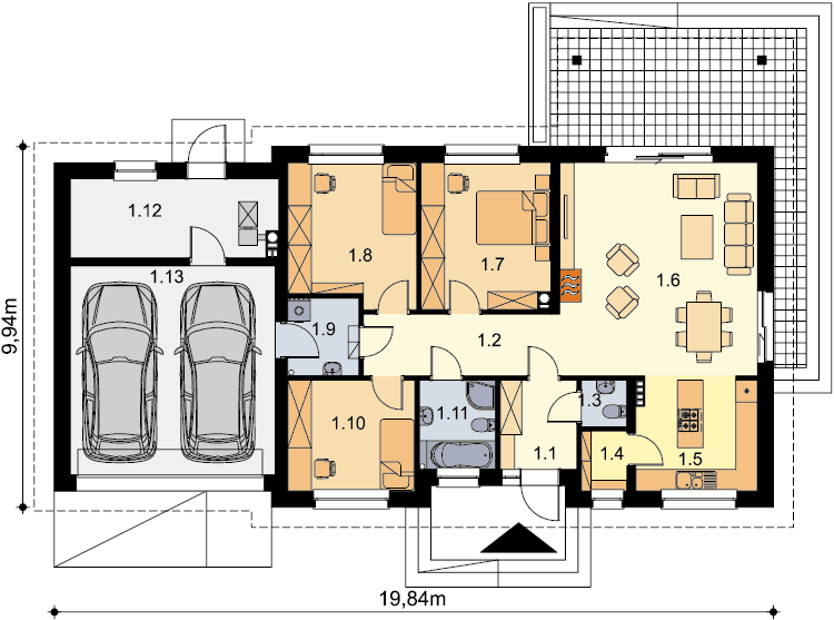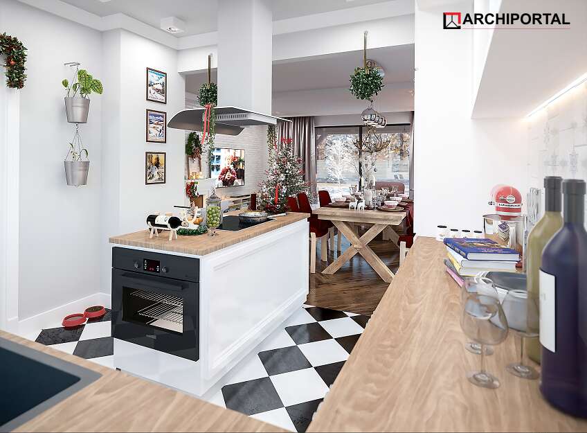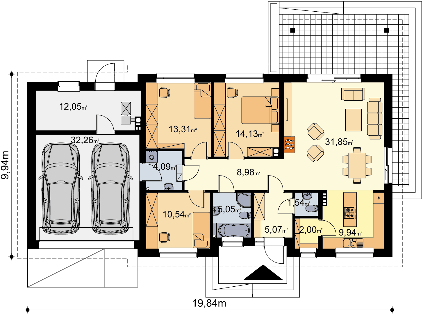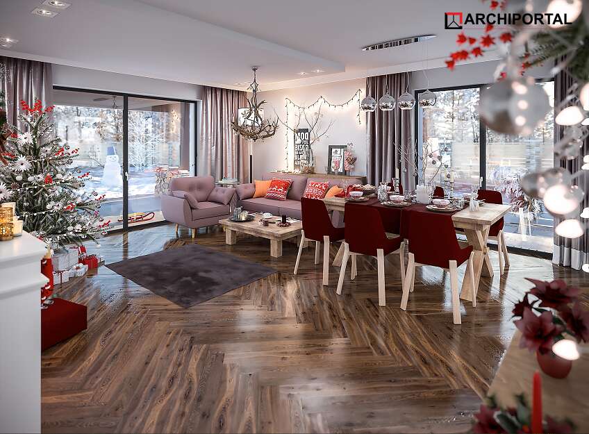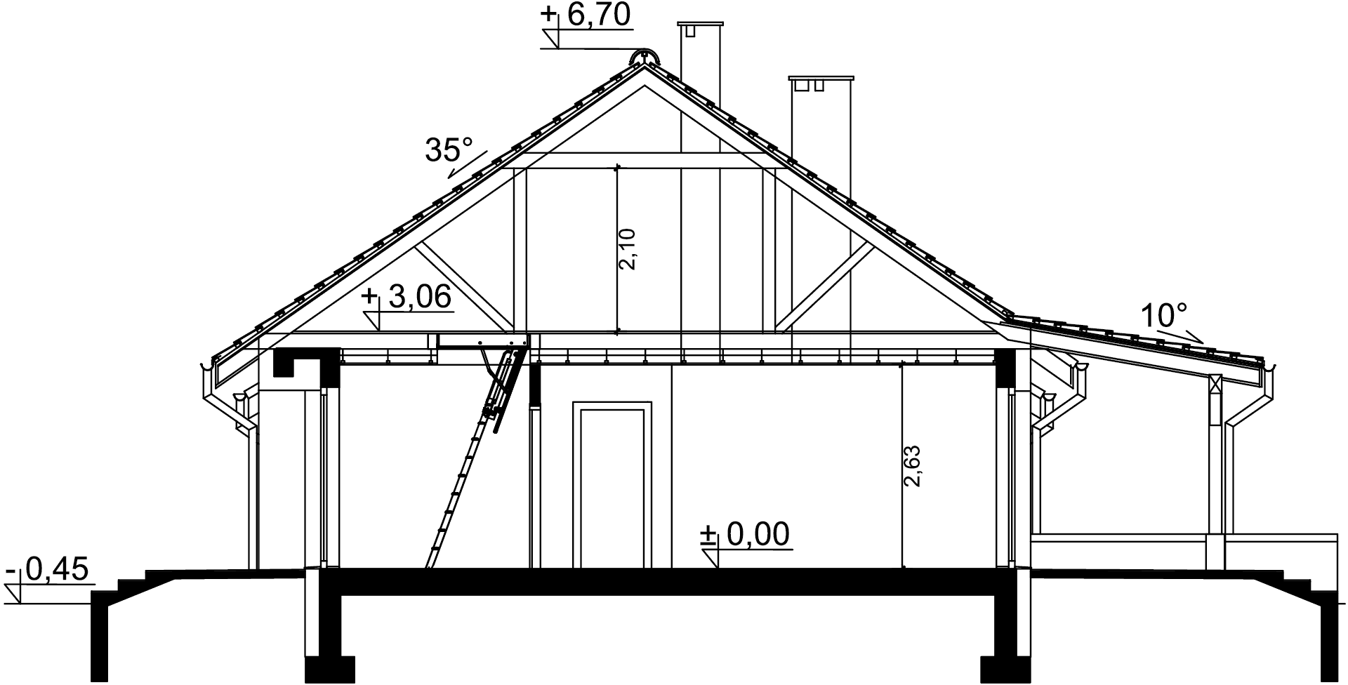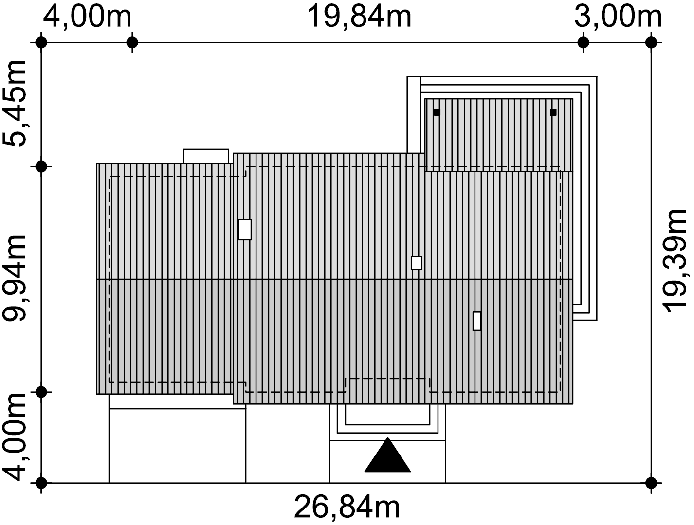 Klasyczny dom parterowy charakteryzujący się prostą formą i nieskomplikowanym dachem, co korzystnie wpływa na oszczędności związane z jego budową oraz późniejszą eksploatacją. Elementy drewniane na elewacji zapewniają mu nowoczesny wygląd, a zadaszony taras z pewnością będzie miejscem odpoczynku i relaksu. W ciągu dnia domownicy mają do dyspozycji duży, dobrze oświetlony salon, połączony z jadalnią. Z pokoju dziennego do ogrodu możemy dostać się przez duże drzwi tarasowe, jak również przez drzwi z boku budynku. Jadalnia płynnie przechodzi w kuchnię, którą po dostawieniu ścianki można przekształcić w zamknięte pomieszczenie. Nie zapomniano również o praktycznej spiżarni i dodatkowej toalecie, dostępnej z wiatrołapu. Część nocna to trzy ustawne pokoje oraz łazienka z miejscem na wannę i prysznic. Do garażu dostajemy się przez pomieszczenie gospodarcze, które może pełnić rolę pralni. Za garażem znajduje się duża kotłownia z wyjściem na zewnątrz. W domu zaprojektowano dwa rodzaje ogrzewania: GAZOWE oraz na PALIWO STAŁE. Od przyszłego inwestora zależy, które z nich wykorzysta w swoim domu. Konstrukcja dachu została zaprojektowana w postaci gotowych wiązarów, będzie to miało niewątpliwy wpływ na szybkość budowy, ale co najważniejsze na niski poziom kosztów. Dodatkowo w budynku zrezygnowano z niektórych ścian nośnych, dzięki takiemu rozwiązaniu przestrzeń może być aranżowana praktycznie w dowolny sposób.