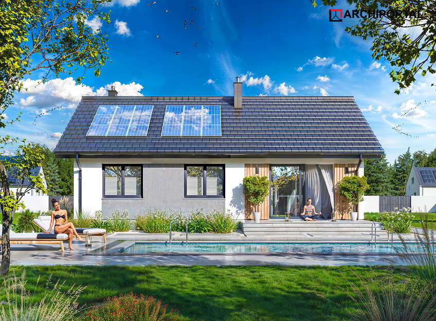 Projekty oznaczone tą ikonką posiadają zaprojektowane ogrzewanie przy pomocy pompy ciepła i ogrzewania podłogowego oraz gratisowy projekt instalacji fotowoltaicznej. Dodatkowo dokumentacja zawiera projekt ogrzewania na biomasę (pellet).