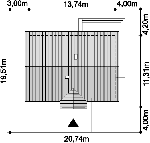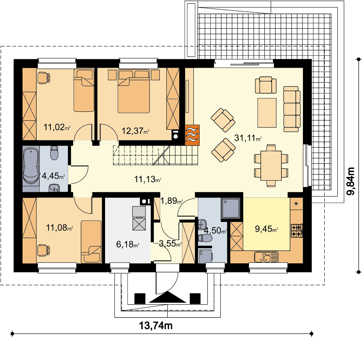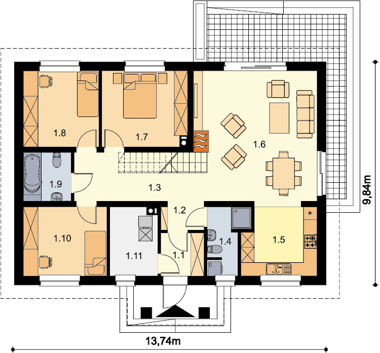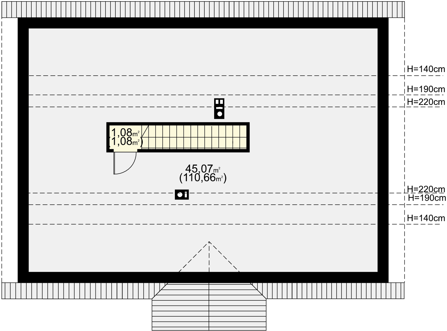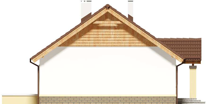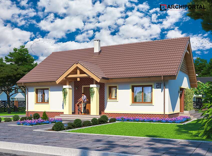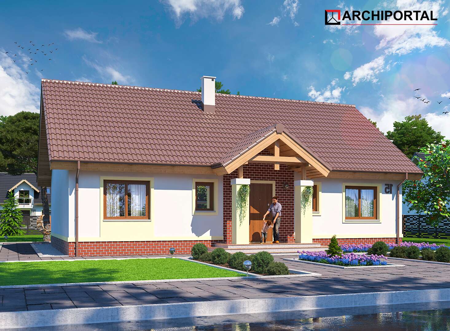 Prosty, parterowy i funkcjonalny dom z możliwością adaptacji poddasza. Wnętrze podzielono na 3 strefy. Strefa dzienna to duży, dobrze oświetlony salon połączony z otwartą kuchnią, którą w razie potrzeby możny oddzielić ścianką działową. Z pokoju dziennego na zewnątrz prowadzą dwa wyjścia – bezpośrednio na ogród i drugie, zaraz przy jadalni. Takie rozwiązanie sprawia, że dom nadaje się na działkę z wjazdem zarówno od północy, jak również od południa. Strefa nocna to 3 ustawne sypialnie oraz 2 łazienki, w jednej bez trudu zmieści się wygodna wanna, w drugiej, oprócz prysznica, znalazło się miejsce na pralkę. Strefa gospodarcza to duża kotłownia, do której dostaniemy się prosto z wiatrołapu. Takie rozwiązanie sprawia, że jest ona oddzielona od części mieszkalnej domu. W budynku zaprojektowano 2 rodzaje ogrzewania: GAZOWE oraz na PALIWO STAŁE. Od przyszłego inwestora zależeć będzie, które z nich wybierze. Prawdziwą zaletą są jednak schody zaprojektowane w korytarzu. Bez rezygnowania z któregokolwiek z pomieszczeń mamy wygodny dostęp na poddasze, które może pełnić rolę strychu, pokoju hobby, pracowni lub dodatkowych pomieszczeń mieszkalnych. Dzięki takiemu rozwiązaniu inwestor ma możliwość adaptacji poddasza w późniejszym okresie bez utraty komfortu mieszkania na parterze. Dzięki prostej, nieskomplikowanej bryle dom jest tani w budowie i późniejszej eksploatacji. Budynek zaprojektowano w oparciu o najnowsze przepisy prawa budowlanego, z dużą dbałością o jego wpływ na środowisko naturalne.