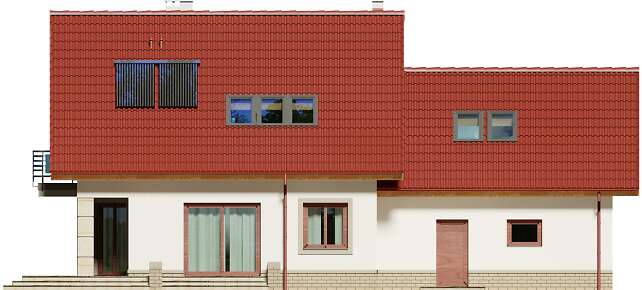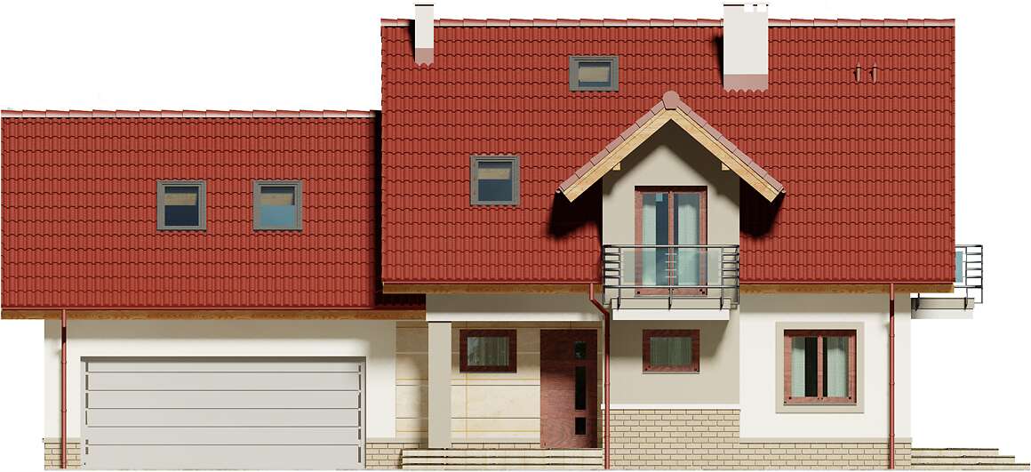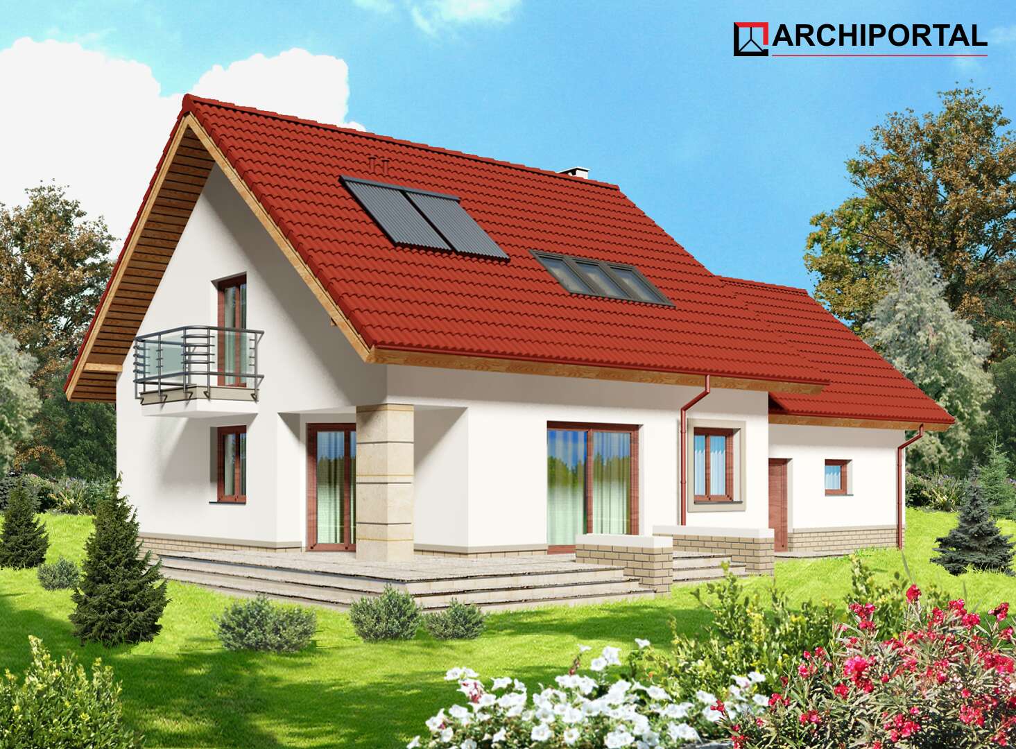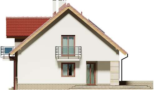 Klasyczny dom w nowoczesnej aranżacji. Zaletą parteru jest przestronny, dobrze oświetlony salon z ciekawym podcieniem, dodatkowy pokój oraz pojemny garaż z miejscem na praktyczne szafy lub sprzęt ogrodniczy. Centralne położenie kominka pozwala rozprowadzić ciepło po całym domu. Nad garażem znajduje się pomieszczenie nieużytkowe dostępne z klatki schodowej, które można zaadoptować na strych lub dodatkowy pokój. W korytarzu na piętrze zaprojektowano schody składane prowadzące na mały stryszek. Dom jest tani w budowie i późniejszej eksploatacji.