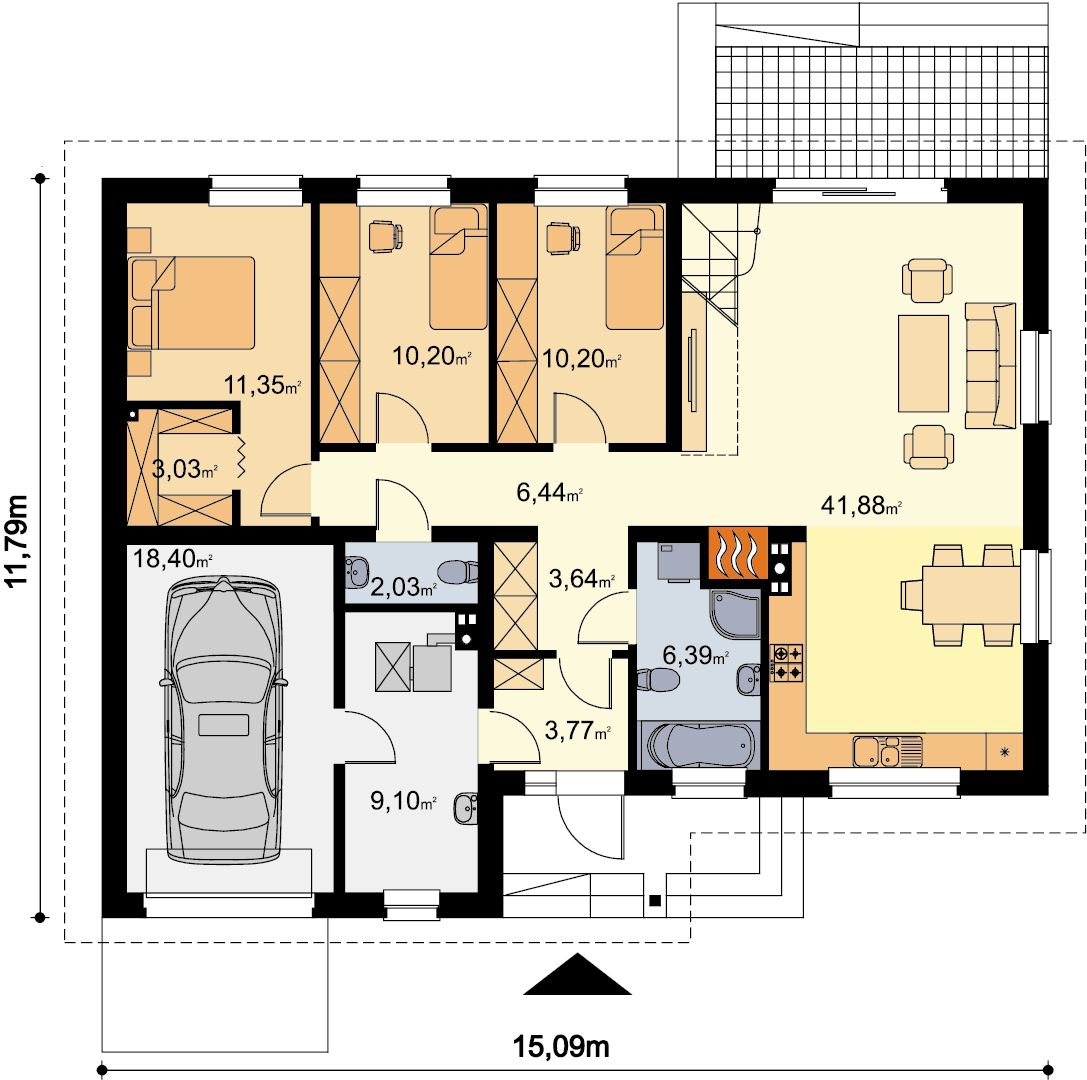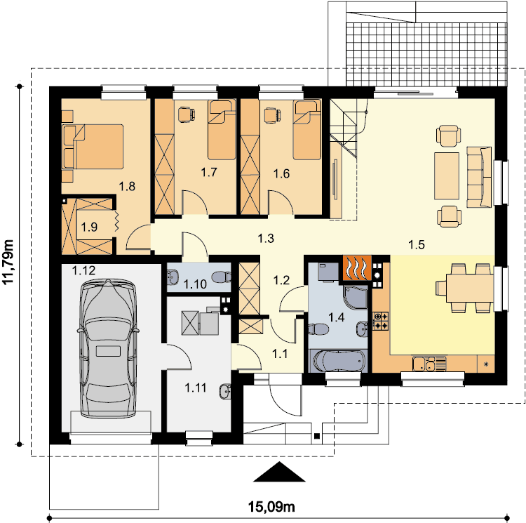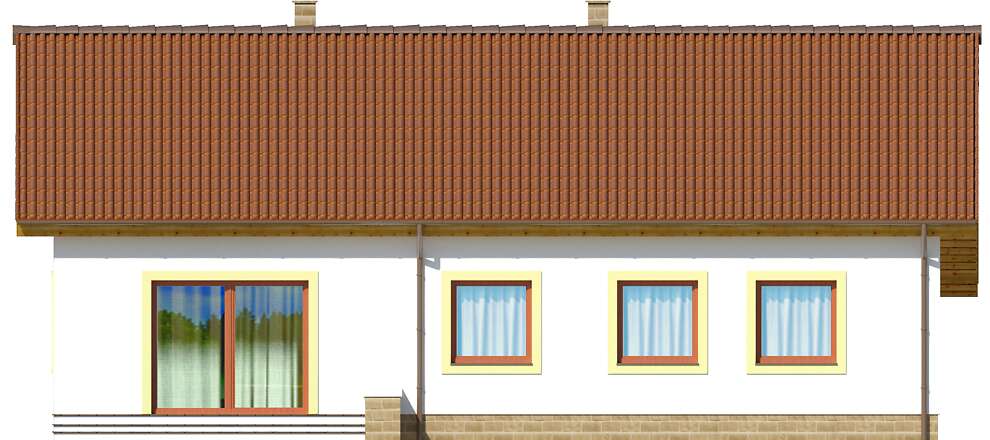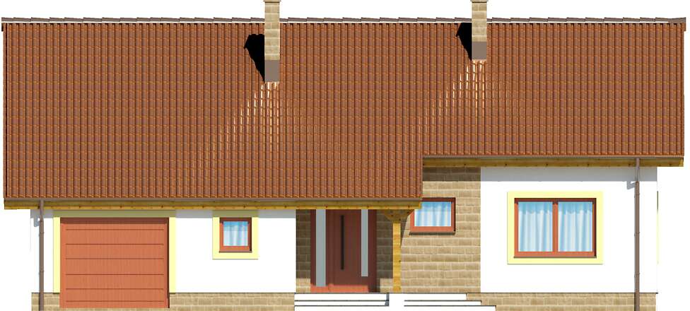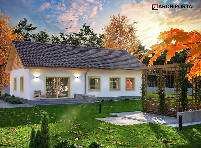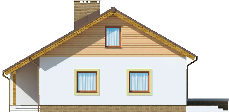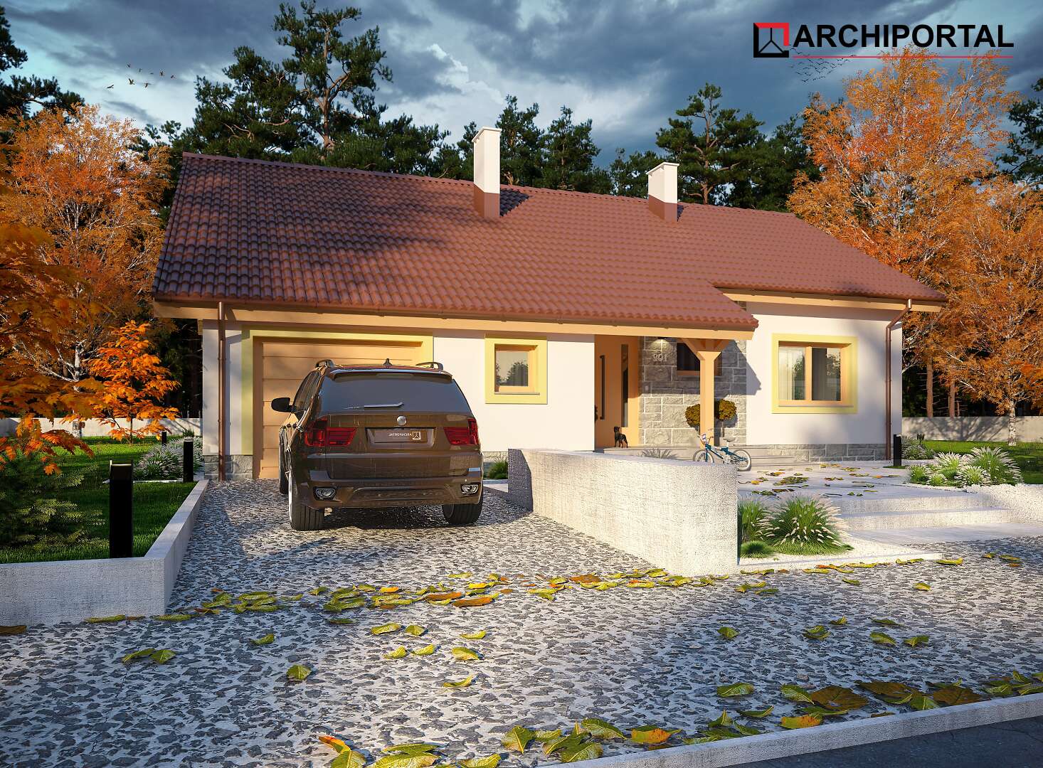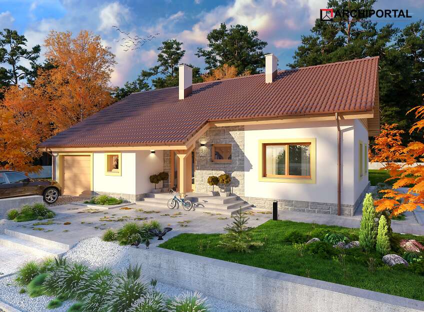 Dom parterowy z wbudowanym garażem i możliwością adaptacji poddasza. Bryła domu jest spójna, a całość przykryto prostym, dwuspadowym dachem, co z pewnością obniży koszty budowy. Do budynku dostajemy się przez wiatrołap, który prowadzi także do dużej kotłowni połączonej z garażem. W domu zaprojektowano dwa rodzaje ogrzewania: gazowe oraz na paliwo stałe – biomasę. Dokumentacja projektu zawiera rozwinięcia obydwu rodzajów instalacji, tak by to inwestor zdecydował, który z nich zastosuje w swoim domu, bez konieczności dodatkowych zmian na etapie adaptacji. W ciągu dnia domownicy mogą relaksować się w dużym, dobrze oświetlonym salonie, połączonym z otwartą kuchnią. Wielkość tych dwóch pomieszczeń to ponad 40 m2. Oczywiście kuchnię można oddzielić od pokoju dziennego ścianką działową. Do dyspozycji mieszkańców są ponad to 3 ustawne pokoje, duża łazienka, z miejscem na wannę, prysznic i pralkę oraz praktyczna toaleta. Okna wszystkich sypialni wychodzą bezpośrednio na ogród, największa z nich ma też własną garderobę. W budynku zaprojektowano strop wylewany, w salonie natomiast schody drewniane prowadzące na nieużytkowe poddasze. Przestrzeń na strychu to dodatkowe 60m2 powierzchni użytkowej, można ją jeszcze powiększyć, podnosząc np. ściankę kolankową. Dodatkowy metraż, po niewielkiej adaptacji można przeznaczyć na studio, pokój hobby, pracownię lub dodatkowe pomieszczenia mieszkalne. Dom jest tani w budowie i późniejszej eksploatacji.