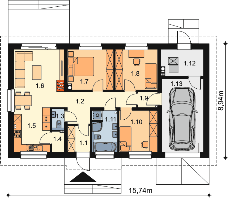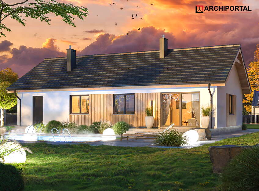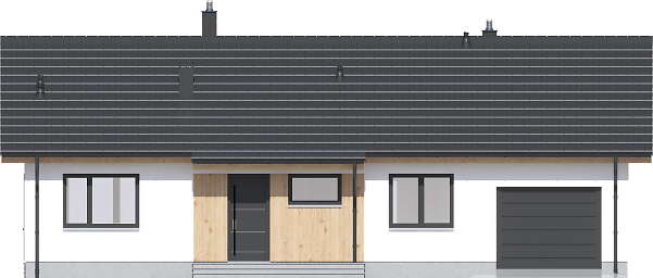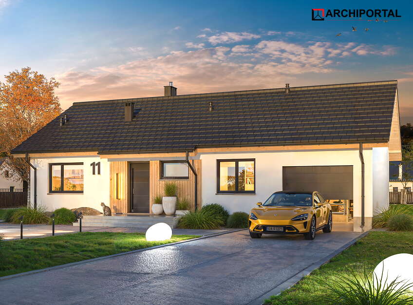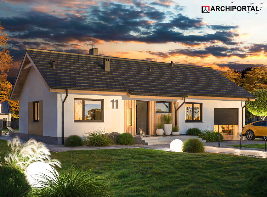 TRACJA 11 MINI to pomniejszona wersja projektu Tracja 11. Jest to atrakcyjny, nowoczesny dom o prostej bryle przykrytej dachem dwuspadowym. Do dyspozycji mieszkańców jest tutaj przestronny salon połączony z otwartą kuchnią, w której przewidziano sporo miejsca na szereg szaf w wysokiej zabudowie. W pobliżu kuchni zaprojektowano praktyczną spiżarnię. Z korytarza dostajemy się bezpośrednio do trzech dużych i ustawnych pokojów, toalety, a także łazienki, która bez trudu pomieści wannę i prysznic. Korytarz prowadzi też bezpośrednio do jednostanowiskowego garażu, za którym zlokalizowano sporą kotłownię z wyjściem na zewnątrz. W budynku zaprojektowano dwa rodzaje ogrzewania: kocioł na BIOMASĘ oraz GAZ ZIEMNY. Inwestor ma w ten sposób wybór i może zdecydować, które ogrzewania zastosować w swoim domu. Kominek położony centralnie w salonie może się natomiast przydać zimą, jako dodatkowe źródło ogrzewania.