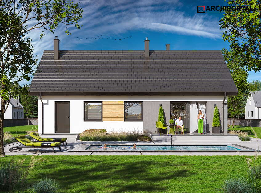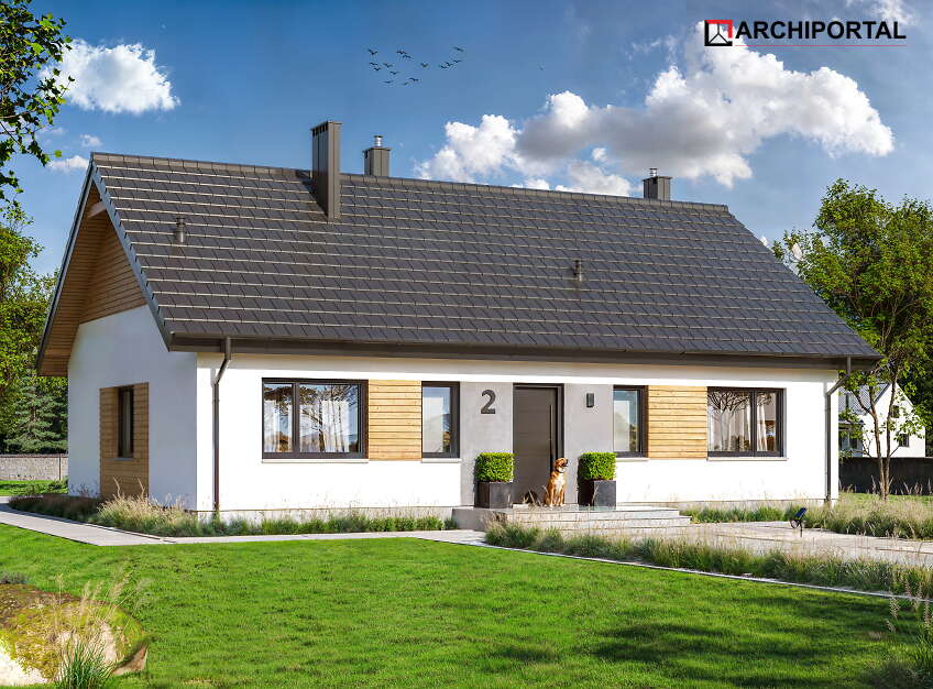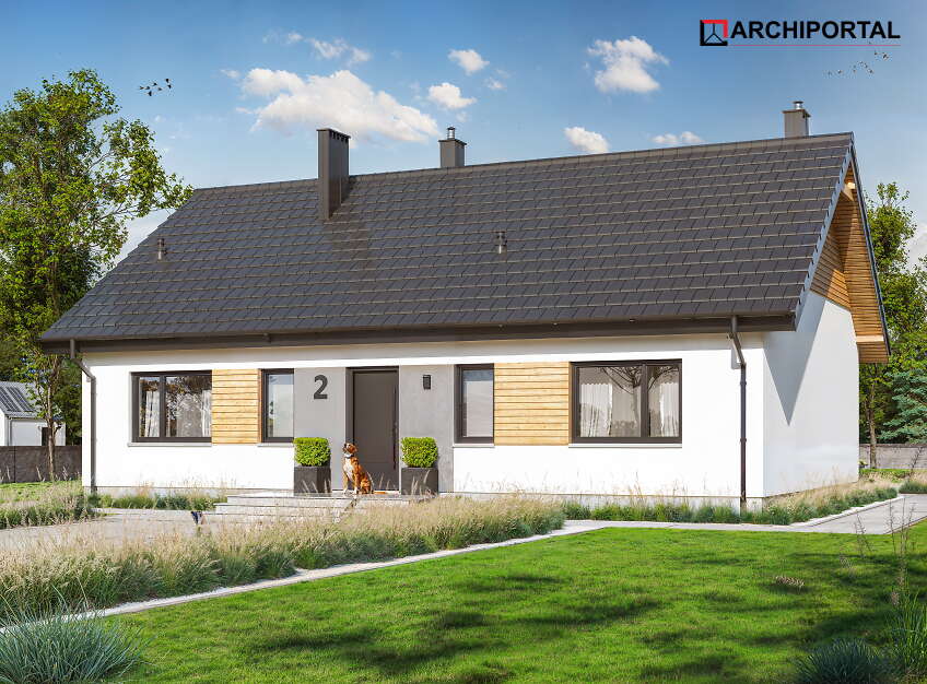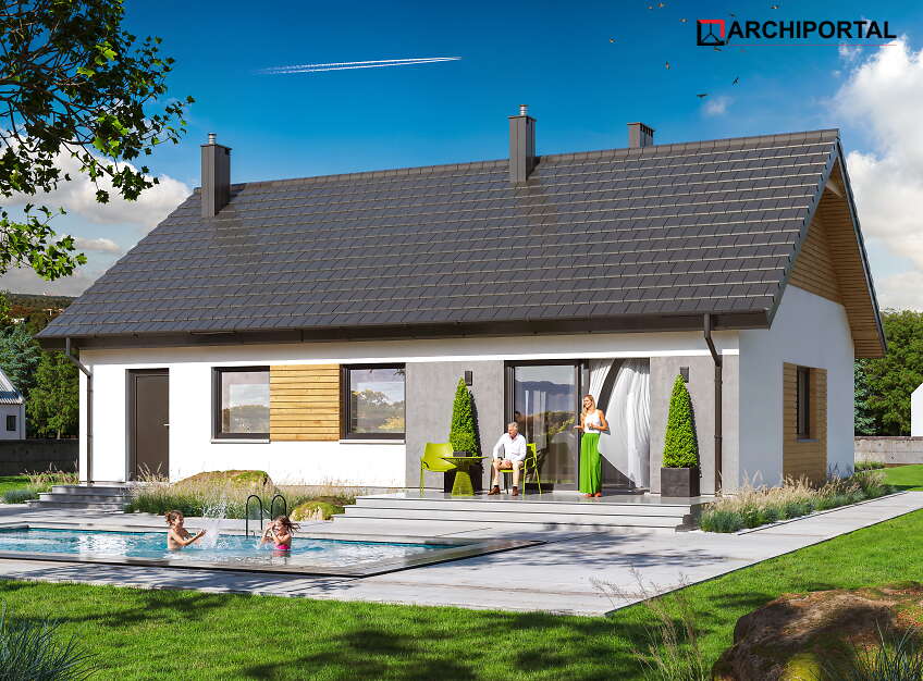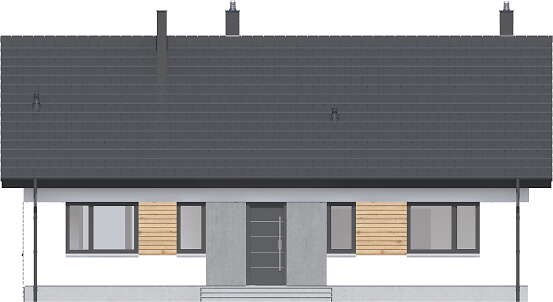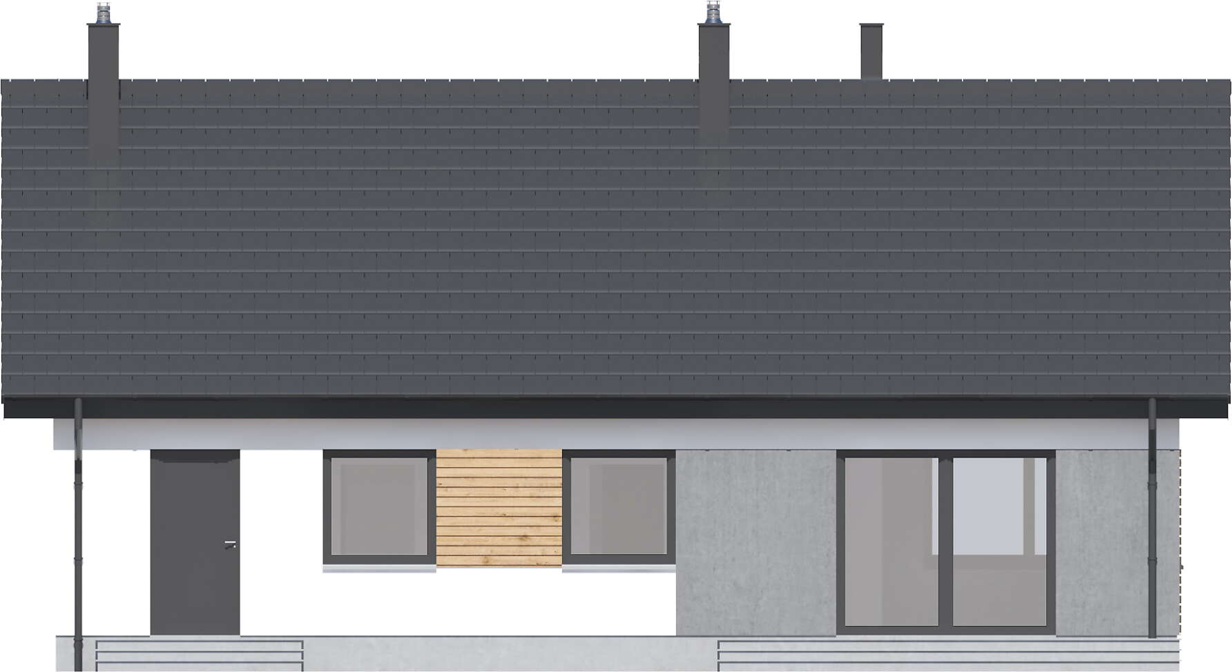 Dom ma prostą bryłę i nieskomplikowany dach, co będzie miało niewątpliwy wpływ na obniżenie kosztów budowy i późniejszej eksploatacji. Elewację budynku można wykończyć zarówno w klasycznym, jak również nowoczesnym stylu, stosując np. modne okładziny drewniane lub drewnopodobne.