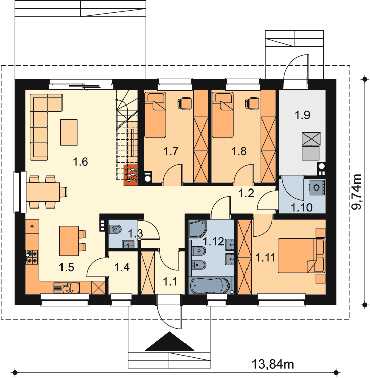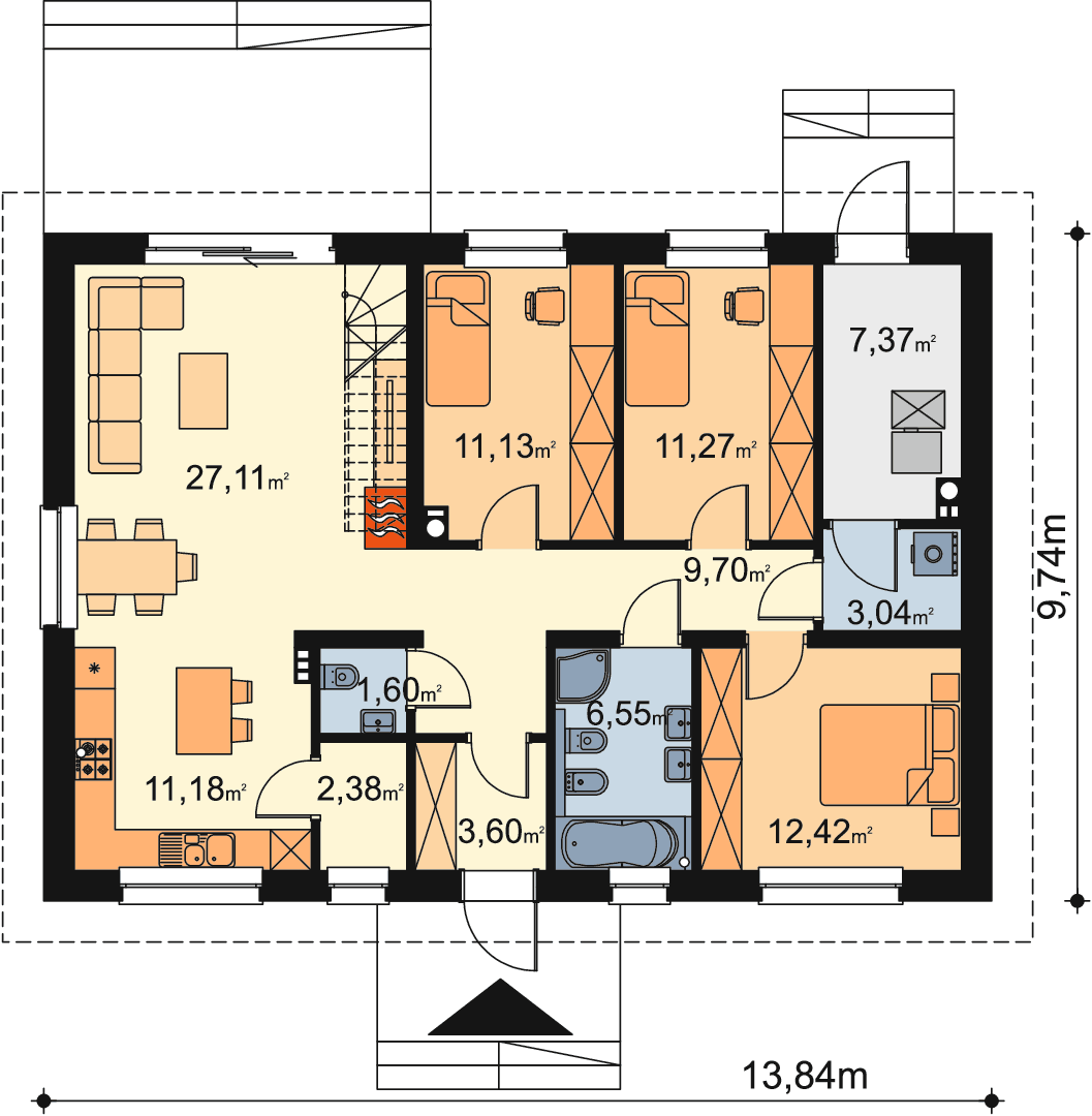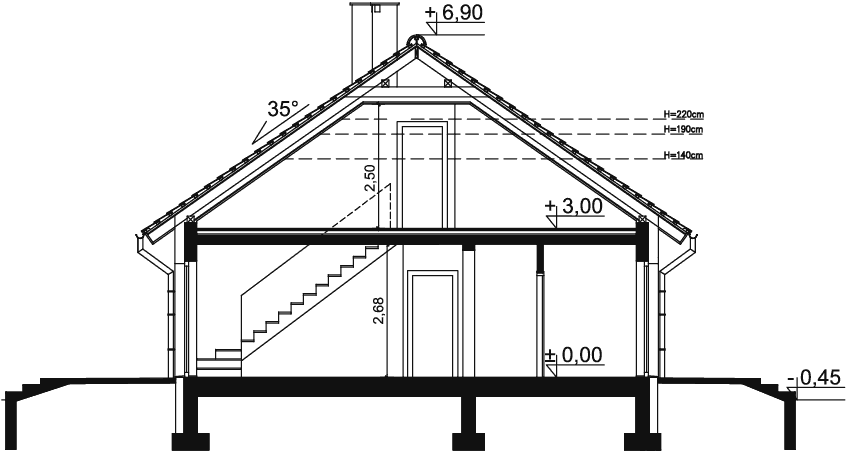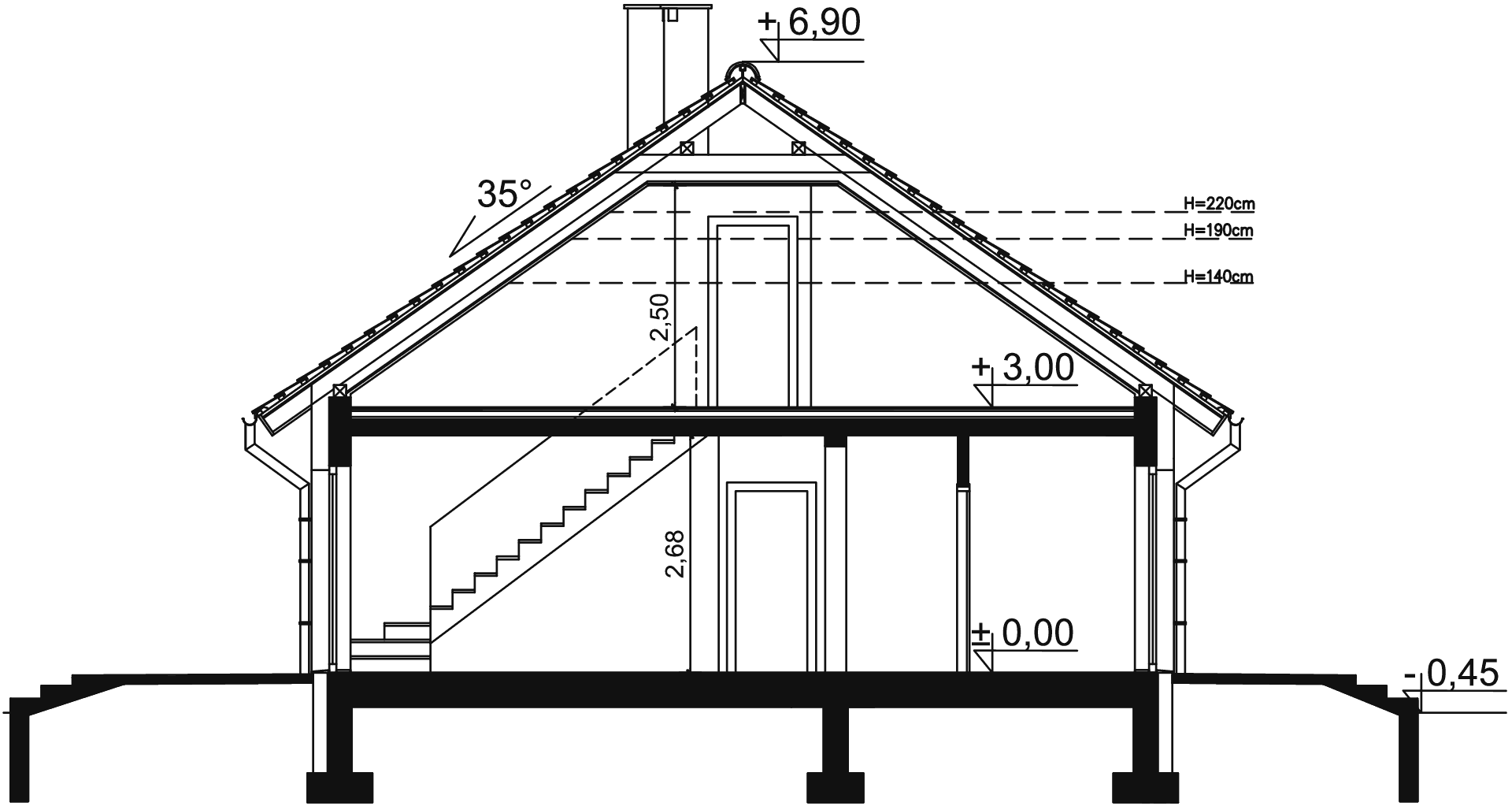 Kolejny wariant popularnego projektu. Tym razem z dachem o koncie nachylenia 35° oraz możliwością adaptacji poddasza. Dom charakteryzuje się z jednej strony prostotą rozwiązań, z drugiej – niezwykłą funkcjonalnością i praktycznością. Pod dostatkiem miejsca znajdzie tu 3-4 osobowa rodzina. Do dyspozycji mieszkańców poza przestronnym salonem połączonym z otwartą kuchnią są: 3 ustawne pokoje, spiżarnia, toaleta, łazienka, z miejscem na wannę i prysznic, pralnia oraz spora kotłownia z bezpośrednim wyjściem na zewnątrz. W kotłowni zaprojektowano 2 rodzaje ogrzewania: GAZOWE oraz na PALIWO STAŁE - BIOMASĘ. Dzięki takiemu zabiegowi, projektu nie trzeba przerabiać, inwestor sam decyduje, który rodzaj ogrzewania zastosuje w swoim domu. Dokumentacja zawiera schematy i rozwinięcia instalacji c.o. i elektrycznych dla obydwu rozwiązań. Ogromnym atutem są schody zaprojektowane w salonie. Dają one dostęp do sporego poddasza, które z łatwością można zaadaptować, jako dodatkową przestrzeń mieszkalną.