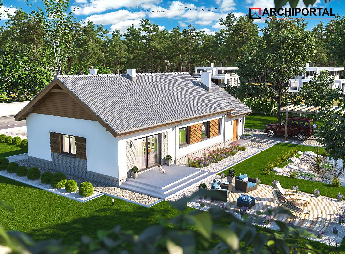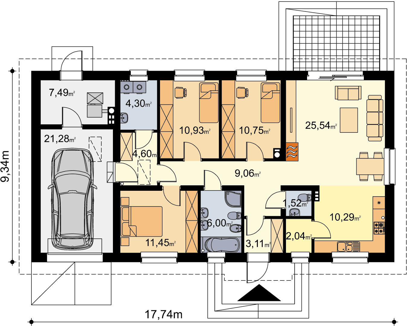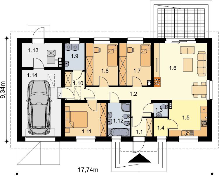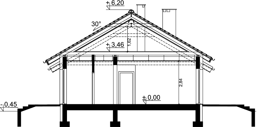 Wersja z garażem bardzo popularnego projektu Tracja 2. Budynek nadal ma do zaoferowania bardzo funkcjonalny układ pomieszczeń. Do dyspozycji mieszkańców jest: obszerny salon połączony z otwartą kuchnią, 3 ustawne pokoje, łazienka z miejscem na wannę i prysznic, dodatkowa toaleta, spiżarnia oraz pralnia. Przez przechodnią garderobę dostajemy się do dużego garażu, za którym mieści się kotłownia. W budynku zaprojektowano 2 rodzaje ogrzewania: GAZOWE oraz na PALIWO STAŁE. Dzięki takiemu zabiegowi, projektu nie trzeba przerabiać, inwestor sam decyduje, który rodzaj ogrzewania zastosuje w swoim domu - dokumentacja zawiera schematy i rozwinięcia instalacji c.o. i elektrycznych dla obydwu rozwiązań.
