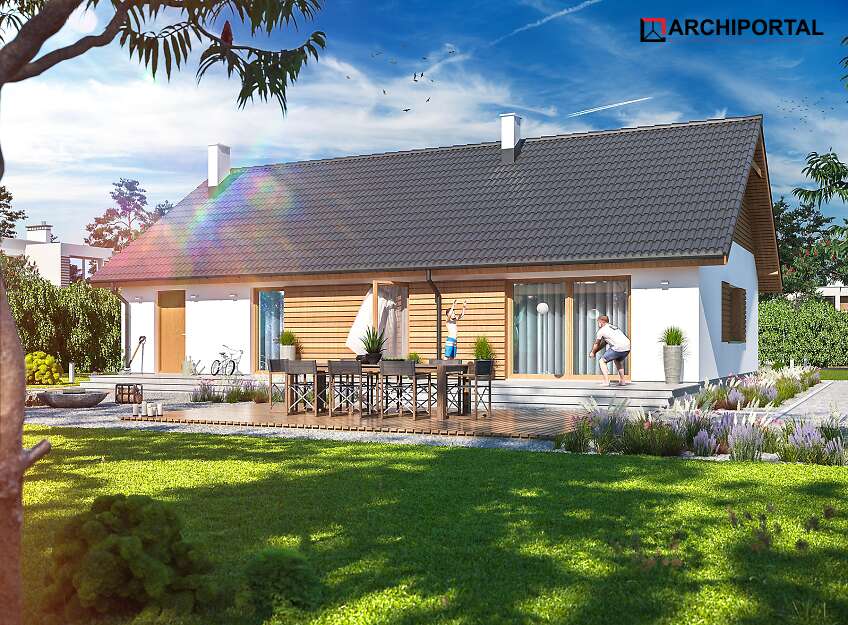 Projekt Tracja 6 należy do popularnej rodziny domów z serii Tracja. Budynek można usytuować na niewielkiej działce, a prosta konstrukcja i nieskomplikowany dach będą miały niewątpliwy wpływ na obniżenie kosztów budowy i późniejszej eksploatacji. Do środka dostajemy się przez ciekawy podcień wejściowy. Następnie z wiatrołapu i holu przechodzimy wprost do korytarza prowadzącego do salonu połączonego z otwartą kuchnią. W razie potrzeby kuchnię można oddzielić od pokoju dziennego ścianką działową. Nie zapomniano tutaj także o praktycznej spiżarni i centralnie usytuowanym kominku. Pozostała część domu to typowa strefa nocna z aż czterema ustawnymi pokojami, łazienką, osobną toaletą, pralnią i dużą kotłownią z bezpośrednim wyjściem na zewnątrz. W budynku zaprojektowano 2 rodzaje ogrzewania: GAZOWE oraz na PALIWO STAŁE. Dzięki takiemu zabiegowi, projektu nie trzeba przerabiać, inwestor sam decyduje, który rodzaj ogrzewania zastosuje w swoim domu - dokumentacja zawiera schematy i rozwinięcia instalacji c.o. i elektrycznych dla obydwu rozwiązań.