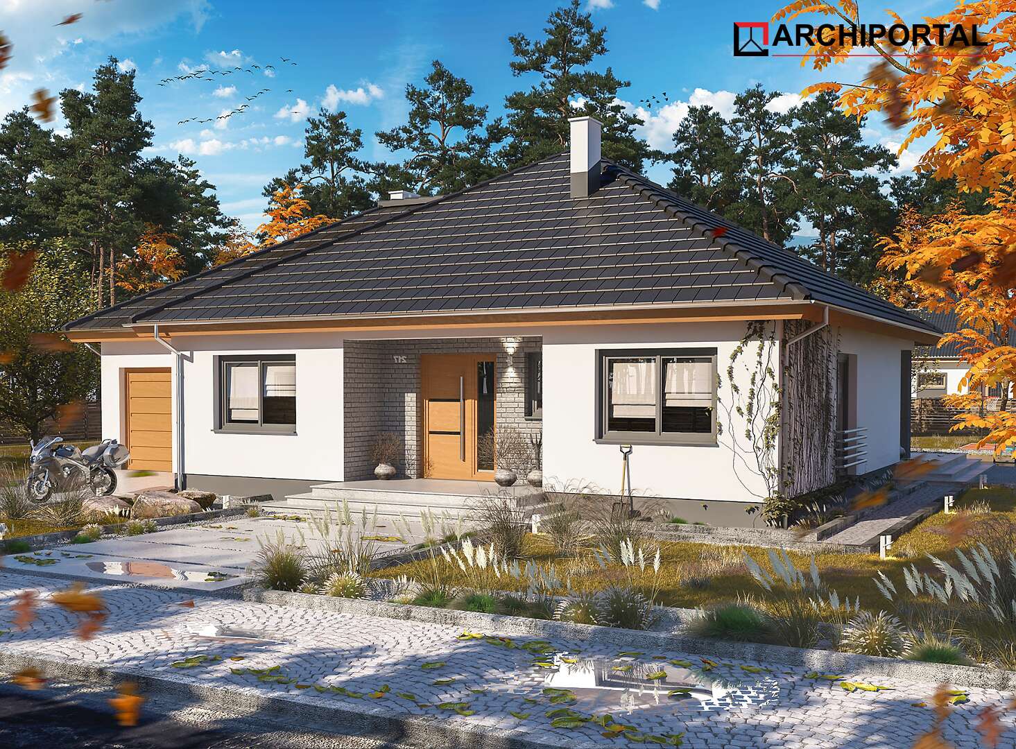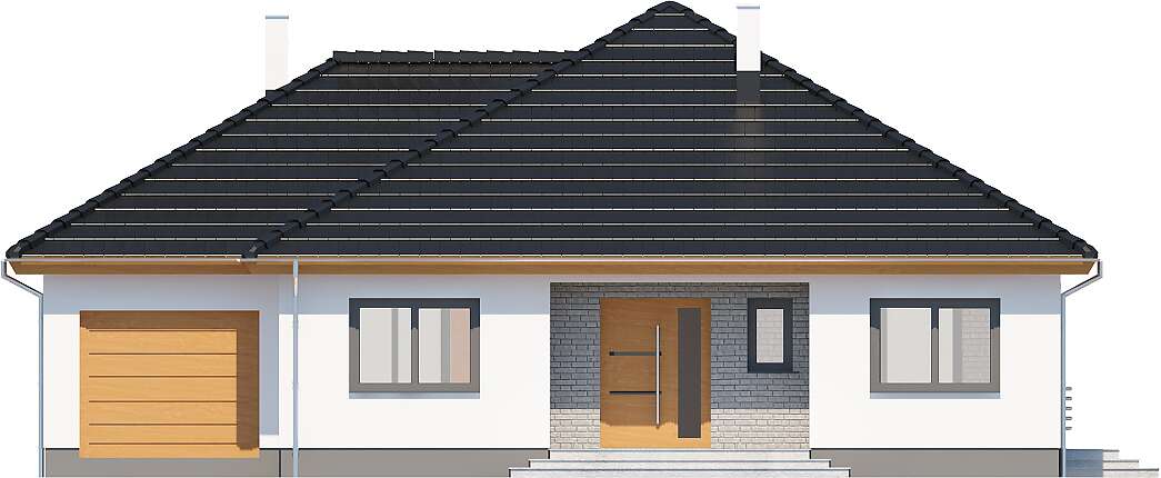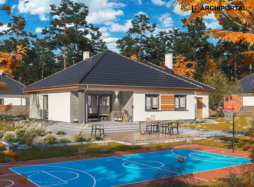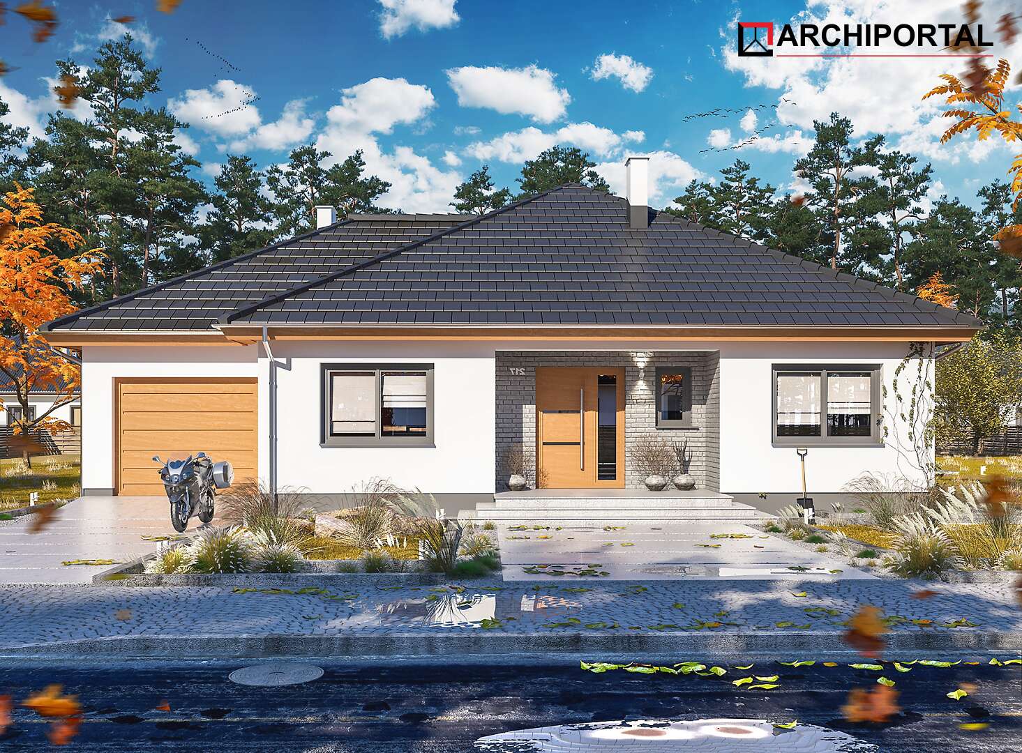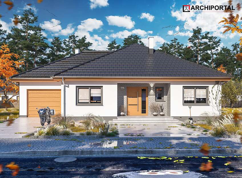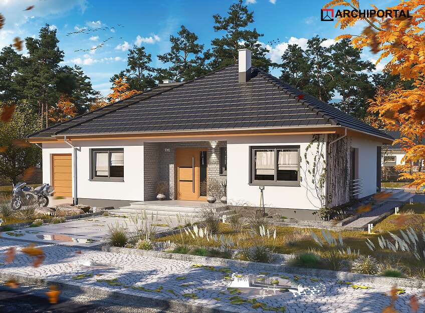 Wersja z garażem popularnego projektu TRYTON. Prosty dom parterowy z czterospadowym dachem i wytrzymałym, ale tanim w budowie stropem TERIVA. Do dyspozycji mieszkańców jest duży, dobrze oświetlony salon, kuchnia z praktyczną spiżarnią, 3 ustawne pokoje, łazienka z miejscem na wannę i prysznic oraz niewielka pralnia. Przez garderobę dostaniemy się natomiast do garażu, za którym znalazła się spora kotłownia. W domu zaprojektowano 2 rodzaje ogrzewania: GAZOWE oraz na PALIWO STAŁE. Dzięki takiemu zabiegowi, projektu nie trzeba przerabiać, inwestor sam decyduje, który rodzaj ogrzewania zastosuje w swoim domu - dokumentacja zawiera schematy i rozwinięcia instalacji c.o. i elektrycznych dla obydwu rozwiązań.
