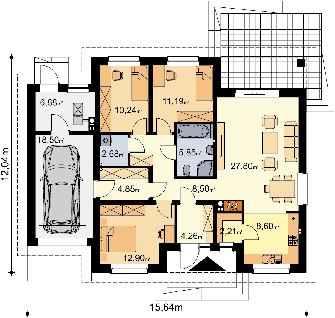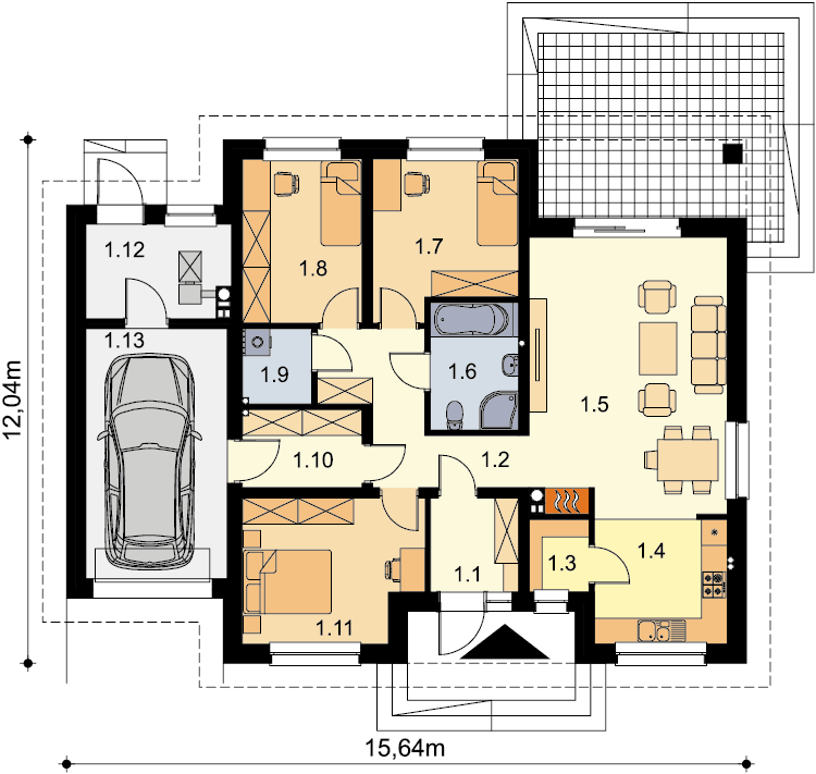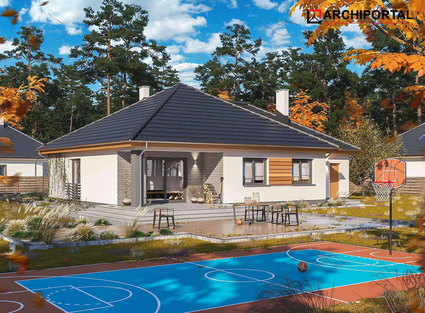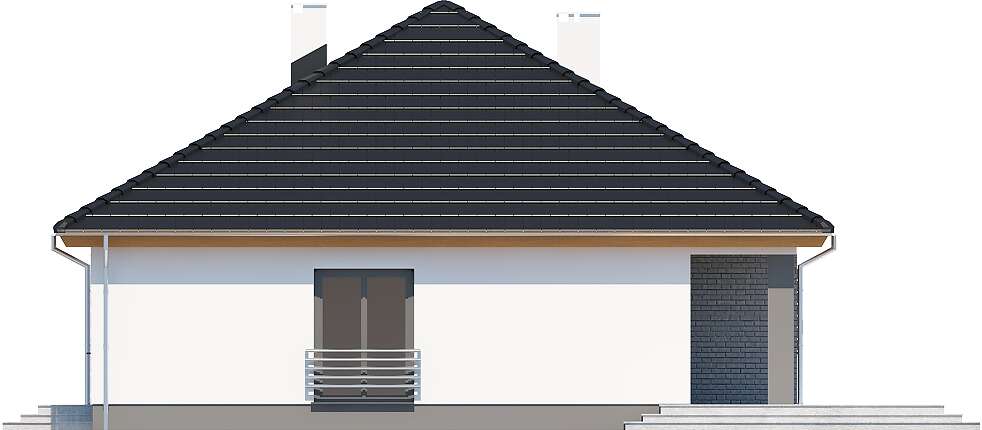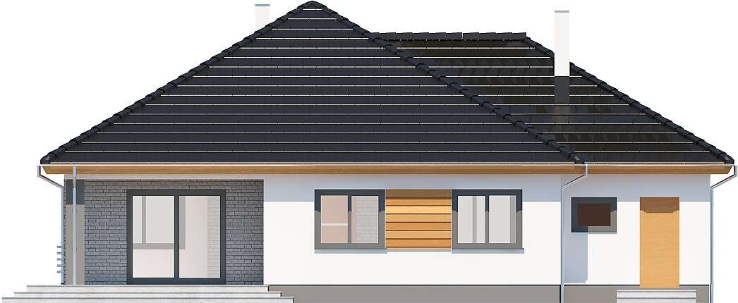 Wersja z garażem popularnego projektu TRYTON. Prosty dom parterowy z czterospadowym dachem i wytrzymałym, ale tanim w budowie stropem TERIVA. Do dyspozycji mieszkańców jest duży, dobrze oświetlony salon, kuchnia z praktyczną spiżarnią, 3 ustawne pokoje, łazienka z miejscem na wannę i prysznic oraz niewielka pralnia. Przez garderobę dostaniemy się natomiast do garażu, za którym znalazła się spora kotłownia. W domu zaprojektowano 2 rodzaje ogrzewania: GAZOWE oraz na PALIWO STAŁE. Dzięki takiemu zabiegowi, projektu nie trzeba przerabiać, inwestor sam decyduje, który rodzaj ogrzewania zastosuje w swoim domu - dokumentacja zawiera schematy i rozwinięcia instalacji c.o. i elektrycznych dla obydwu rozwiązań.