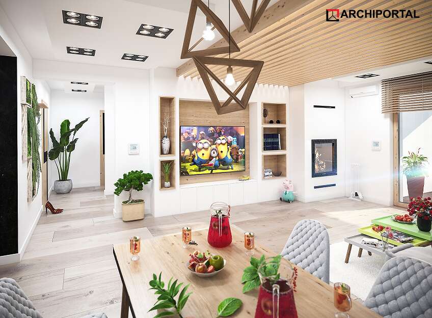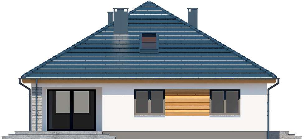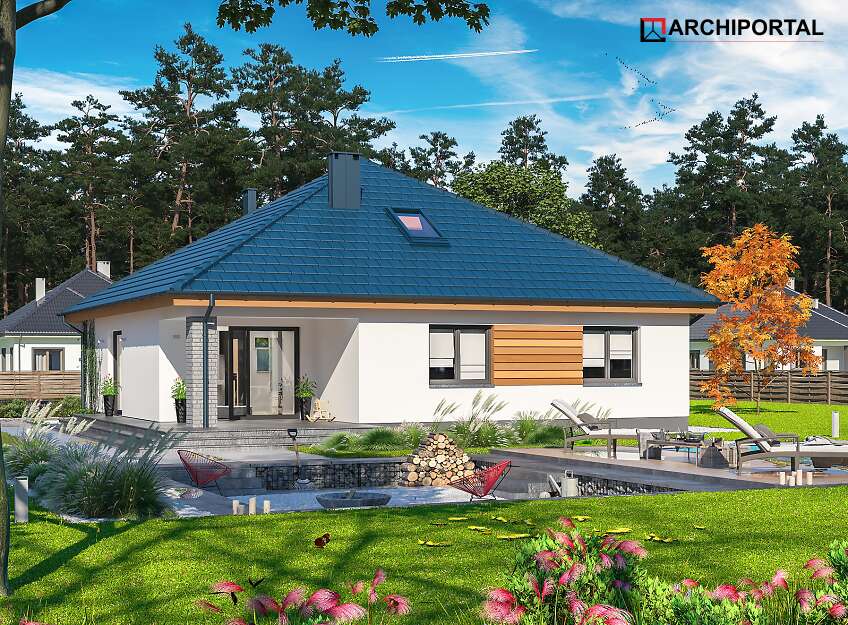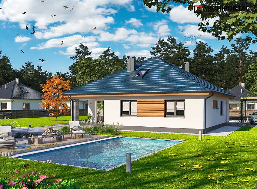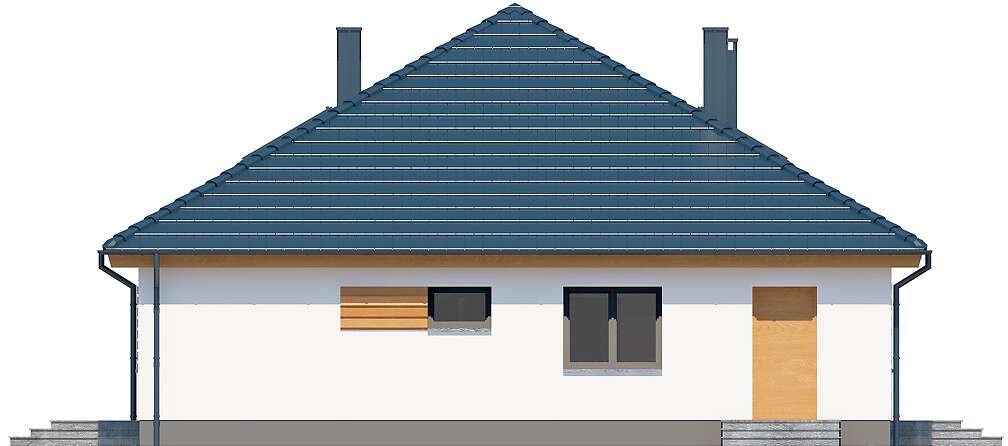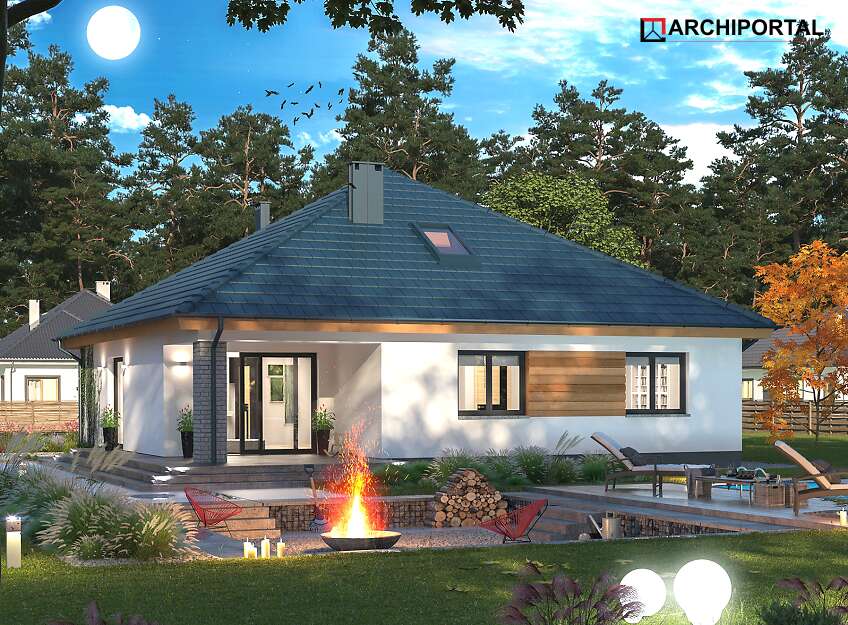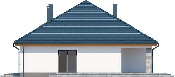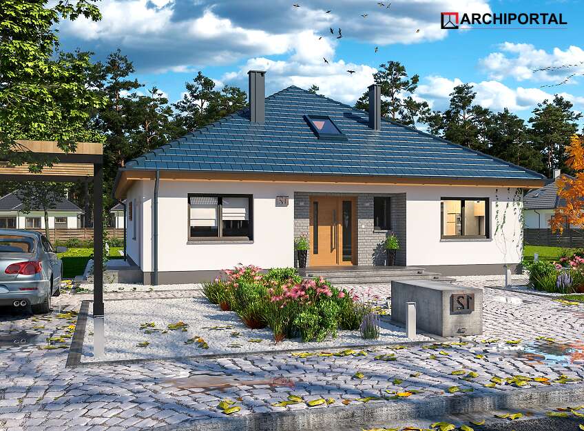 Projekt domu parterowego z dachem czterospadowym, którego rzut oparto na kwadracie. Budynek cechu duża funkcjonalność i dobre rozplanowanie pomieszczeń. Do dyspozycji mieszkańców jest: przestronny, jasny salon połączony z otwartą kuchnią, 3 ustawne pokoje, łazienka, toaleta, pralnia i spiżarnia. Wprost z wiatrołapu dostajemy się do dużej kotłowni z bezpośrednim wyjściem na zewnątrz. W domu zaprojektowano 2 rodzaje ogrzewania: GAZOWE oraz na PALIWO STAŁE. Dzięki takiemu zabiegowi, projektu nie trzeba przerabiać, inwestor sam decyduje, który rodzaj ogrzewania zastosuje w swoim domu - dokumentacja zawiera schematy i rozwinięcia instalacji c.o. i elektrycznych dla obydwu rozwiązań.