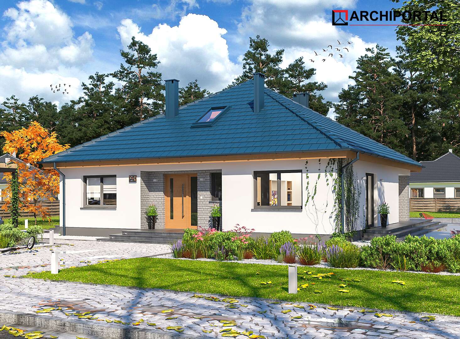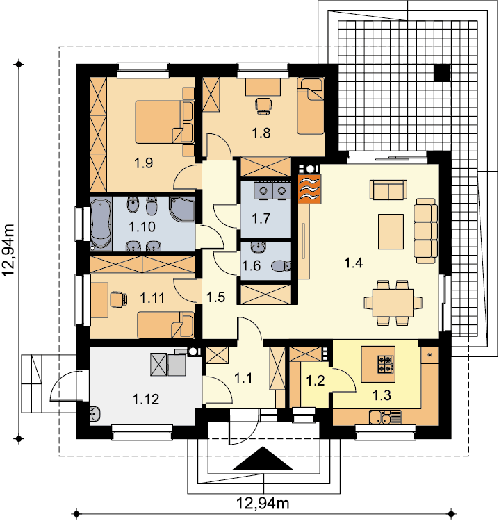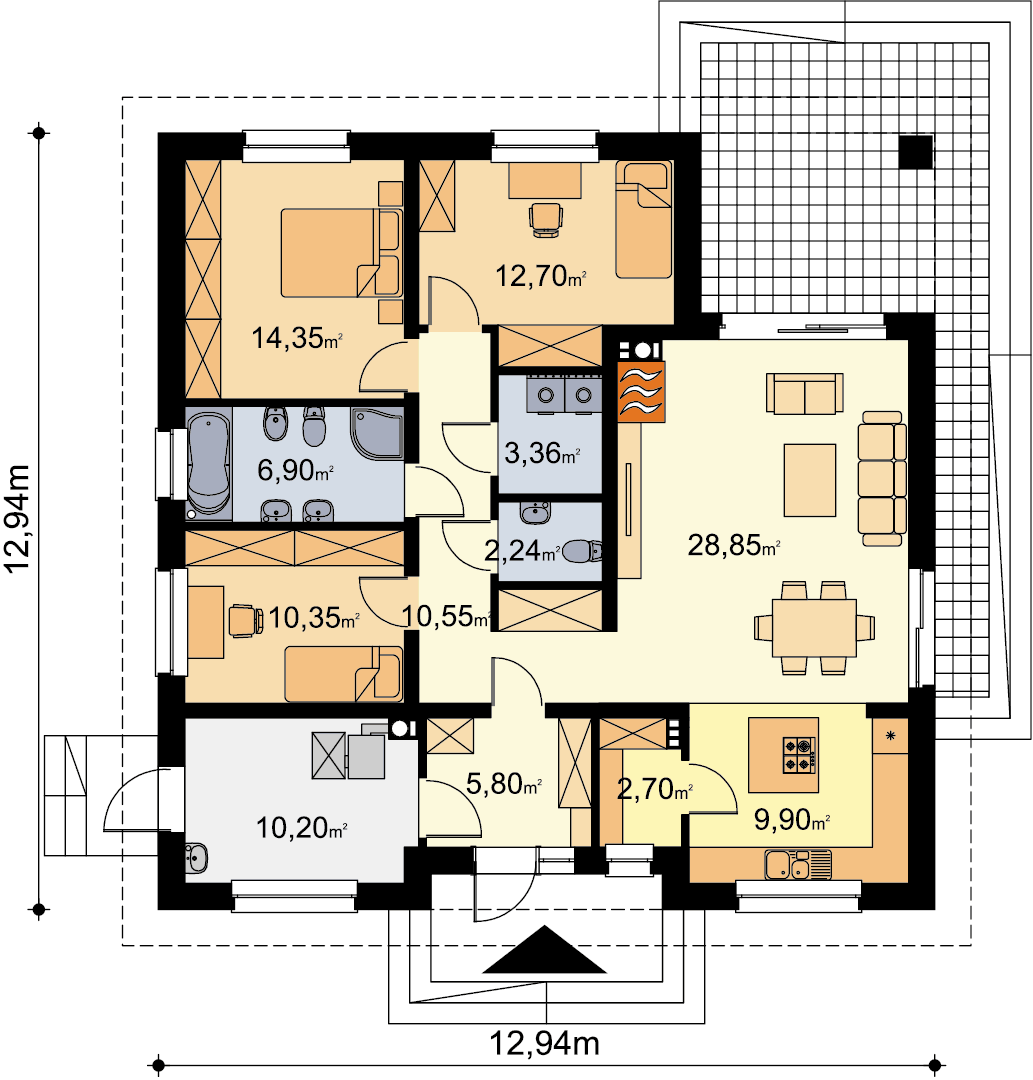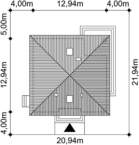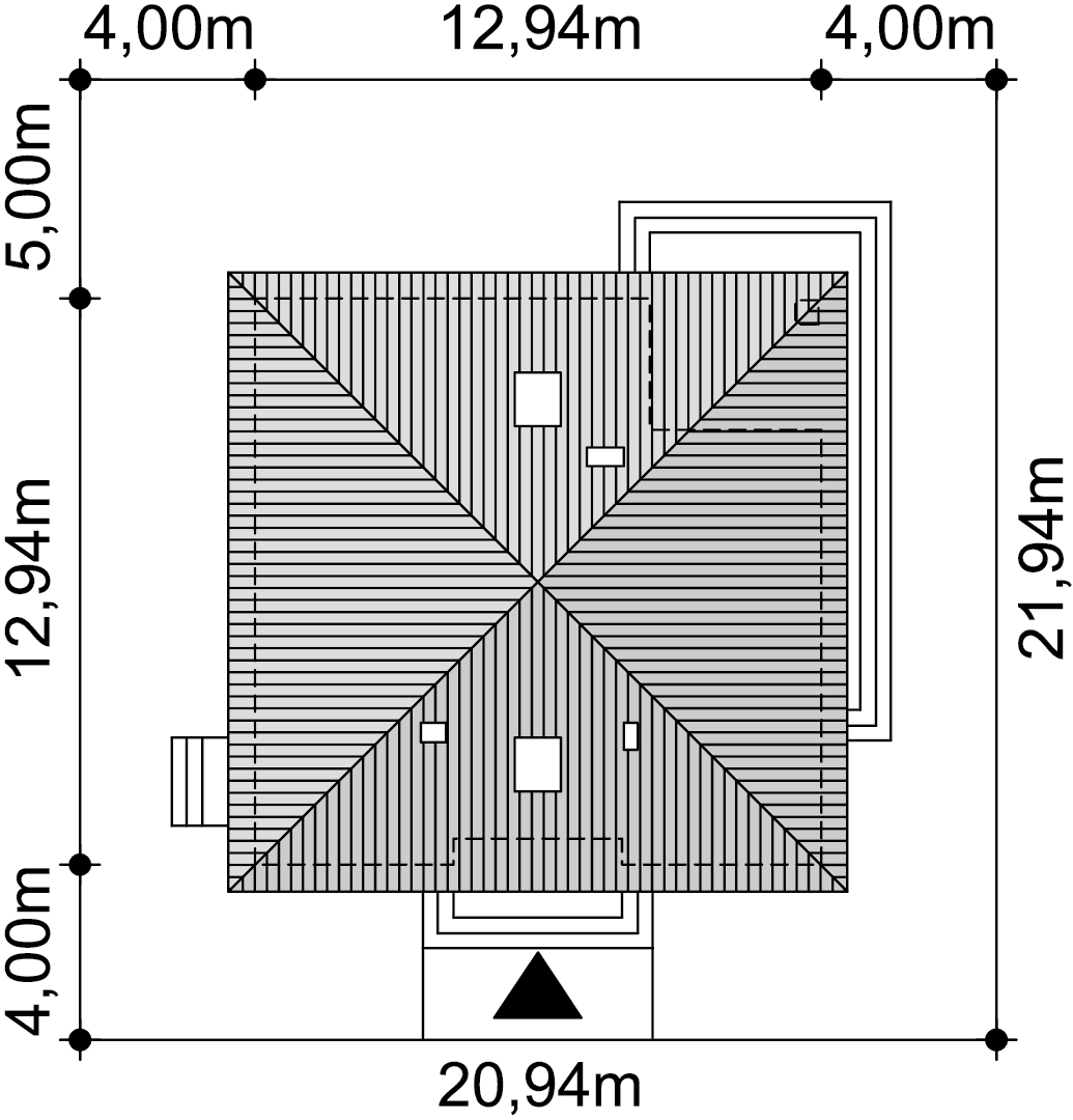 Projekt domu parterowego z dachem czterospadowym, którego rzut oparto na kwadracie. Budynek cechu duża funkcjonalność i dobre rozplanowanie pomieszczeń. Do dyspozycji mieszkańców jest: przestronny, jasny salon połączony z otwartą kuchnią, 3 ustawne pokoje, łazienka, toaleta, pralnia i spiżarnia. Wprost z wiatrołapu dostajemy się do dużej kotłowni z bezpośrednim wyjściem na zewnątrz. W domu zaprojektowano 2 rodzaje ogrzewania: GAZOWE oraz na PALIWO STAŁE. Dzięki takiemu zabiegowi, projektu nie trzeba przerabiać, inwestor sam decyduje, który rodzaj ogrzewania zastosuje w swoim domu - dokumentacja zawiera schematy i rozwinięcia instalacji c.o. i elektrycznych dla obydwu rozwiązań.