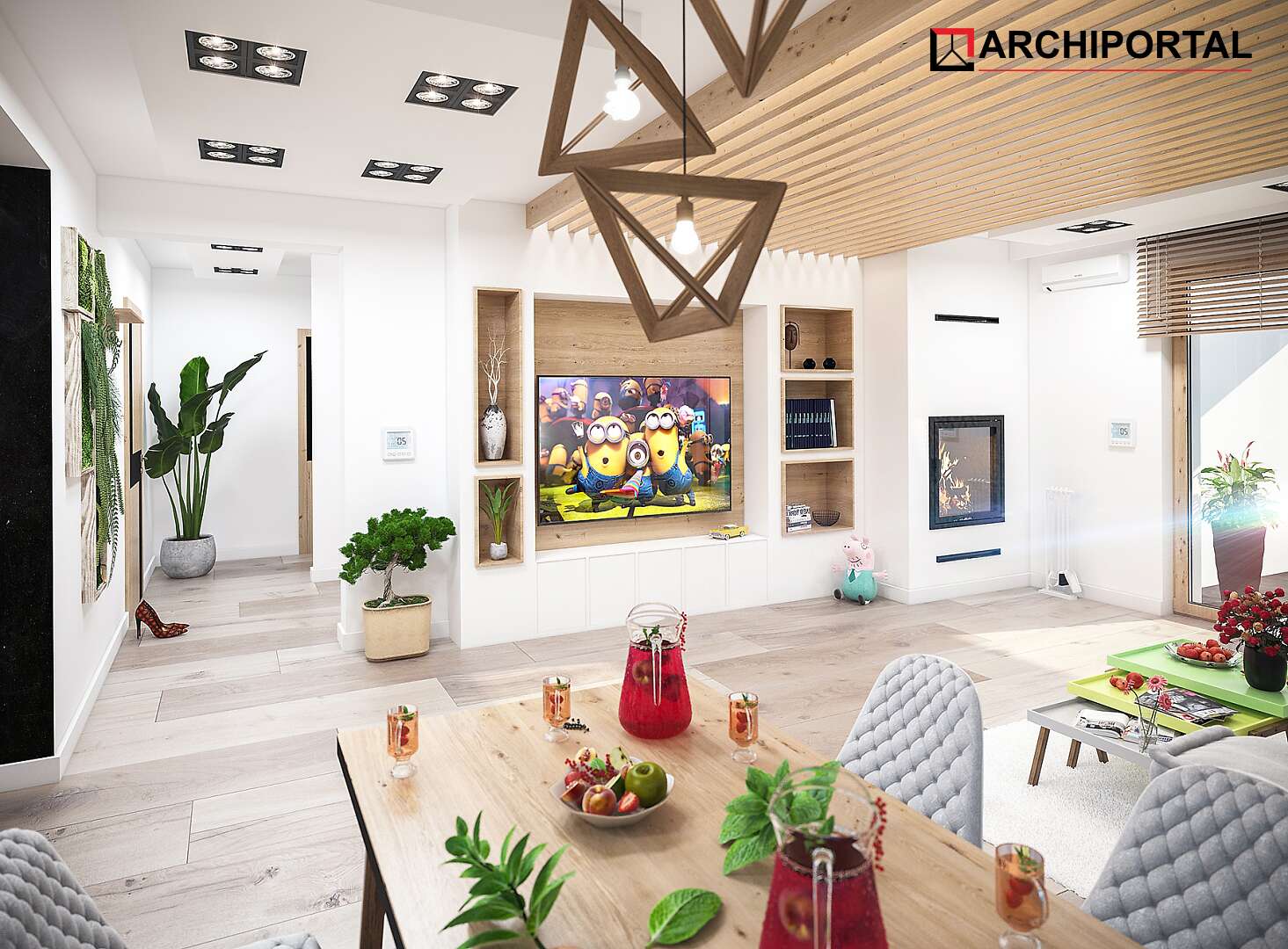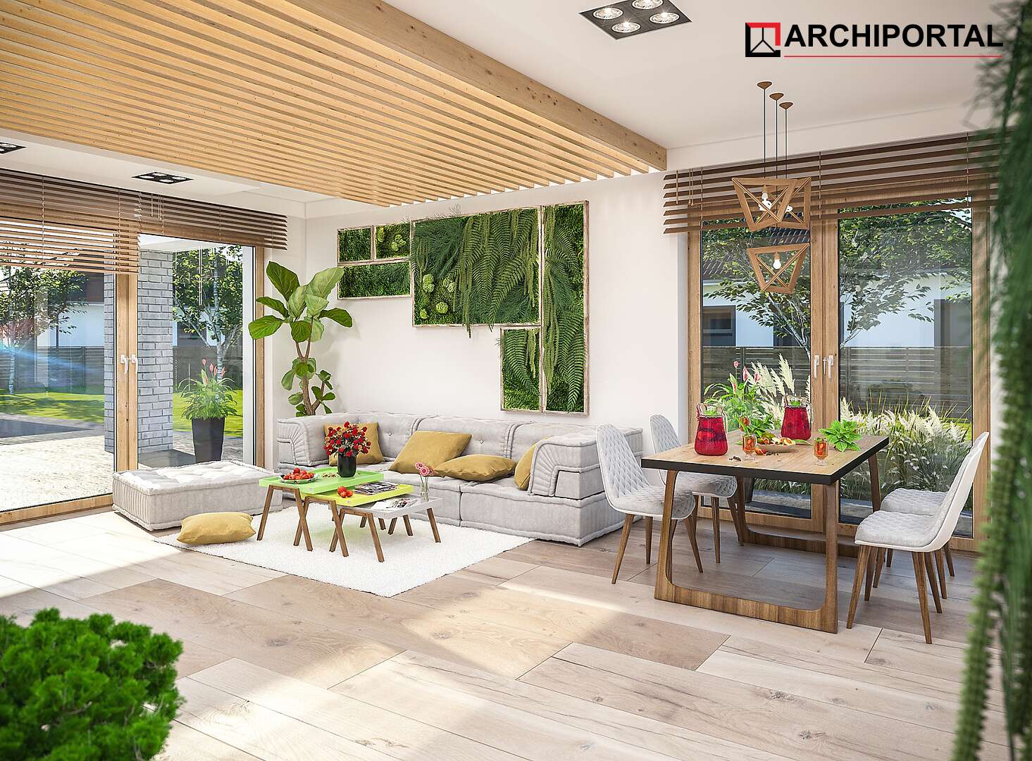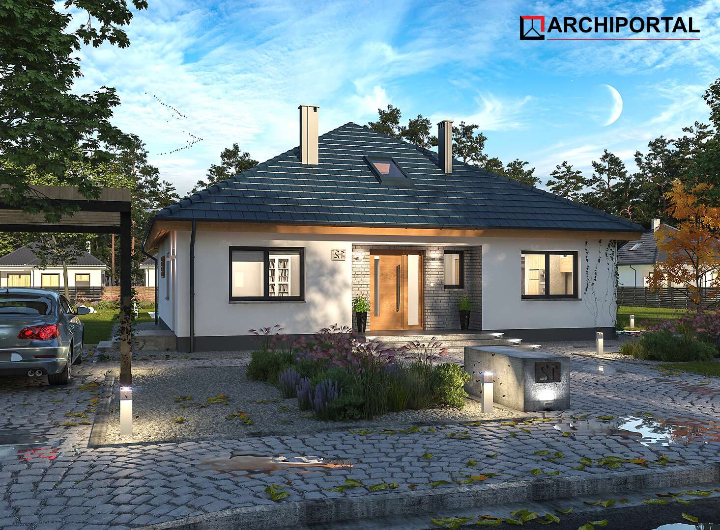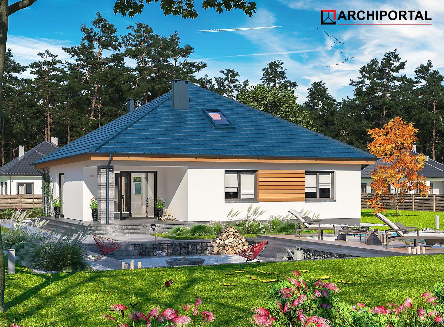 Projekt domu parterowego z dachem czterospadowym, którego rzut oparto na kwadracie. Budynek cechu duża funkcjonalność i dobre rozplanowanie pomieszczeń. Do dyspozycji mieszkańców jest: przestronny, jasny salon połączony z otwartą kuchnią, 3 ustawne pokoje, łazienka, toaleta, pralnia i spiżarnia. Wprost z wiatrołapu dostajemy się do dużej kotłowni z bezpośrednim wyjściem na zewnątrz. W domu zaprojektowano 2 rodzaje ogrzewania: GAZOWE oraz na PALIWO STAŁE. Dzięki takiemu zabiegowi, projektu nie trzeba przerabiać, inwestor sam decyduje, który rodzaj ogrzewania zastosuje w swoim domu - dokumentacja zawiera schematy i rozwinięcia instalacji c.o. i elektrycznych dla obydwu rozwiązań.