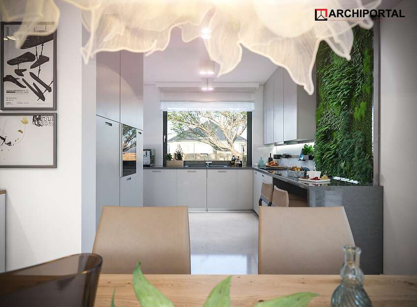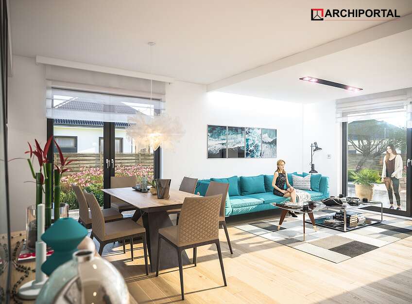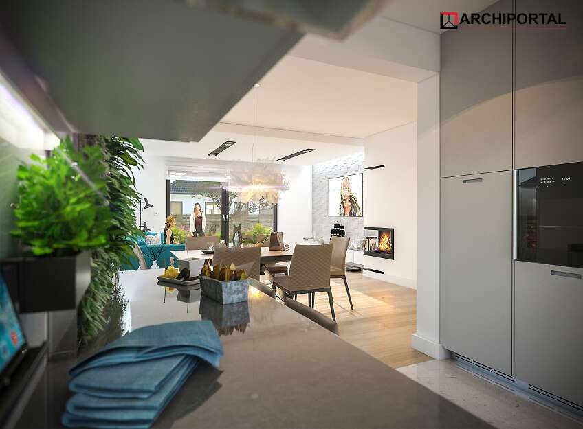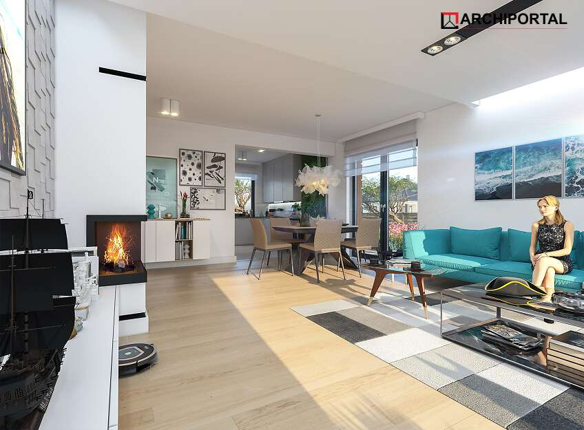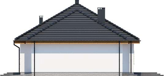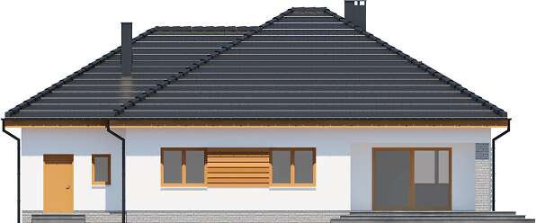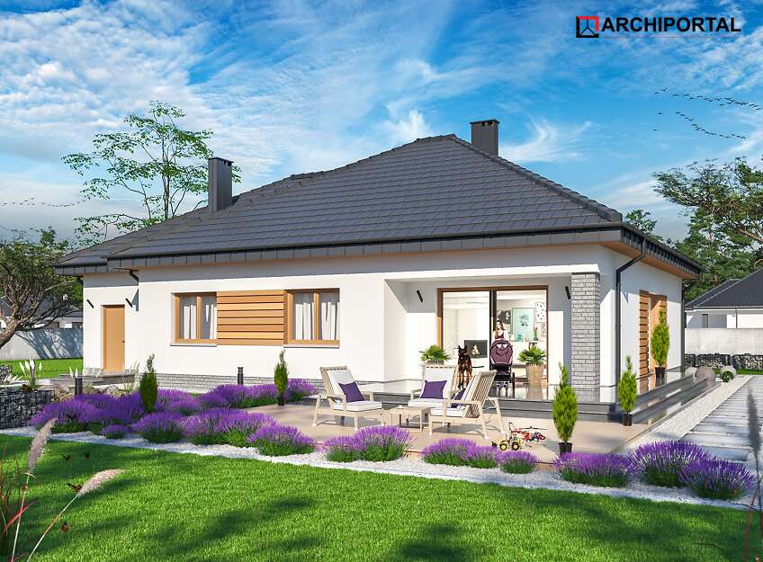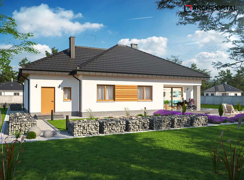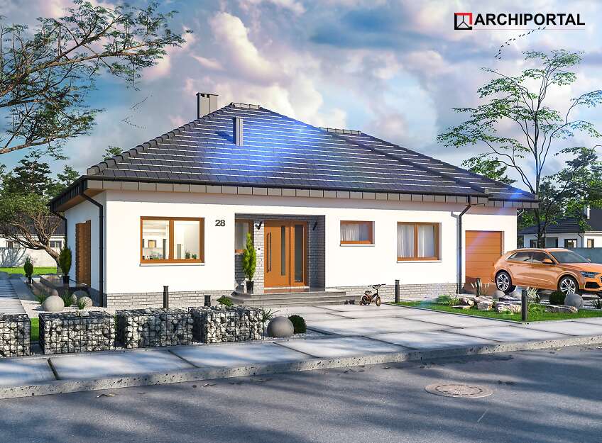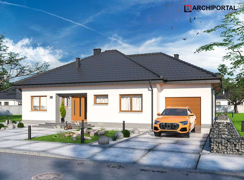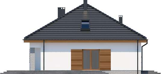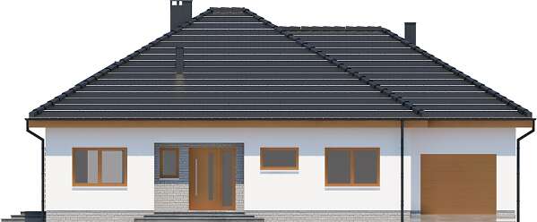 Budynek został zaprojektowany z myślą o 4-5 osobowej rodzinie, zgrabna forma, czterospadowy dach oraz przemyślany układ funkcjonalny wnętrza z pewnością zadowolą przyszłych inwestorów. Do środka dostajemy się przez spory wiatrołap a z niego bezpośrednio do obszernego holu. W ciągu dnia domownicy mogą relaksować się w dużym, dobrze oświetlonym salonie z centralnie umieszczonym kominkiem. Bezpośrednio z pokojem dziennym sąsiaduje otwarta, nowoczesna kuchnia, w pobliżu której zaprojektowano praktyczną spiżarnie. W domu znalazły się ponadto 3 ustawne pokoje, spora łazienka, dodatkowa toaleta i przechodnia pralnia, z której dostaniemy się wprost do garażu. Zaraz za nim umiejscowiono dużą kotłownię z bezpośrednim wyjściem na zewnątrz. W budynku zaprojektowano 2 rodzaje ogrzewania: GAZOWE oraz na PALIWO STAŁE. Dzięki takiemu zabiegowi, projektu nie trzeba przerabiać, inwestor sam decyduje, który rodzaj ogrzewania zastosuje w swoim domu - dokumentacja zawiera schematy i rozwinięcia instalacji c.o. i elektrycznych dla obydwu rozwiązań.