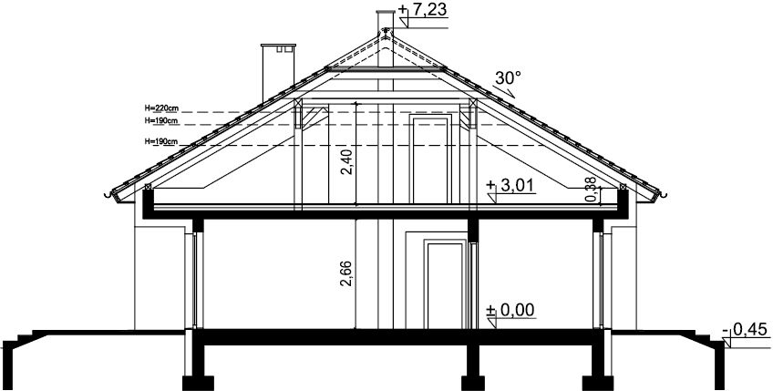 • Ściany zewnętrzne dwuwarstwowe z betonu komórkowego 24cm + 20cm styropianu.