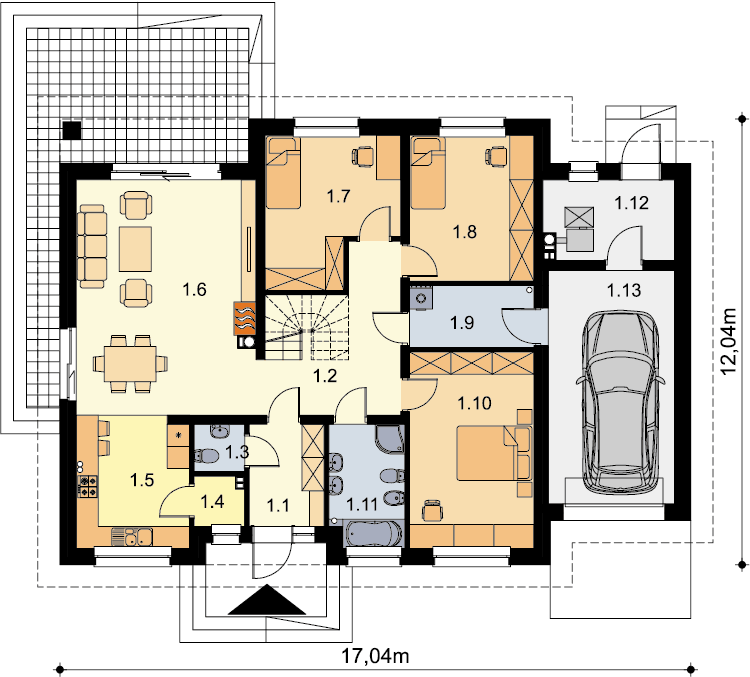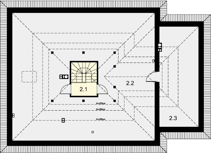 Prawdziwą zaletą są jednak schody znajdujące się w korytarzu. Prowadzą one na strych, który w prosty sposób można przekształcić w pokój hobby, pracownię, studio lub dodatkowe pomieszczenia mieszkalne. Solidny strop żelbetowy daje pełną swobodę aranżacji dodatkowej przestrzeni na poddaszu z doprojektowaniem dodatkowej łazienki włącznie.
