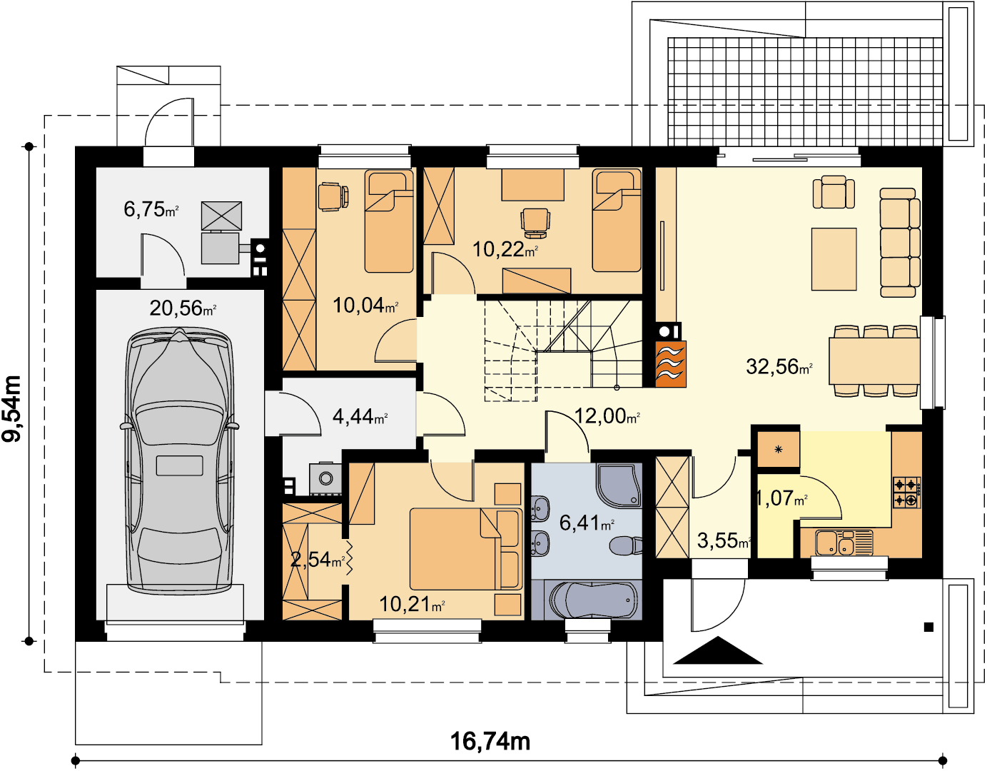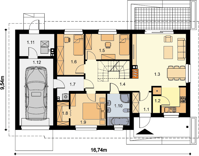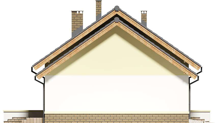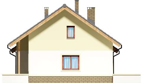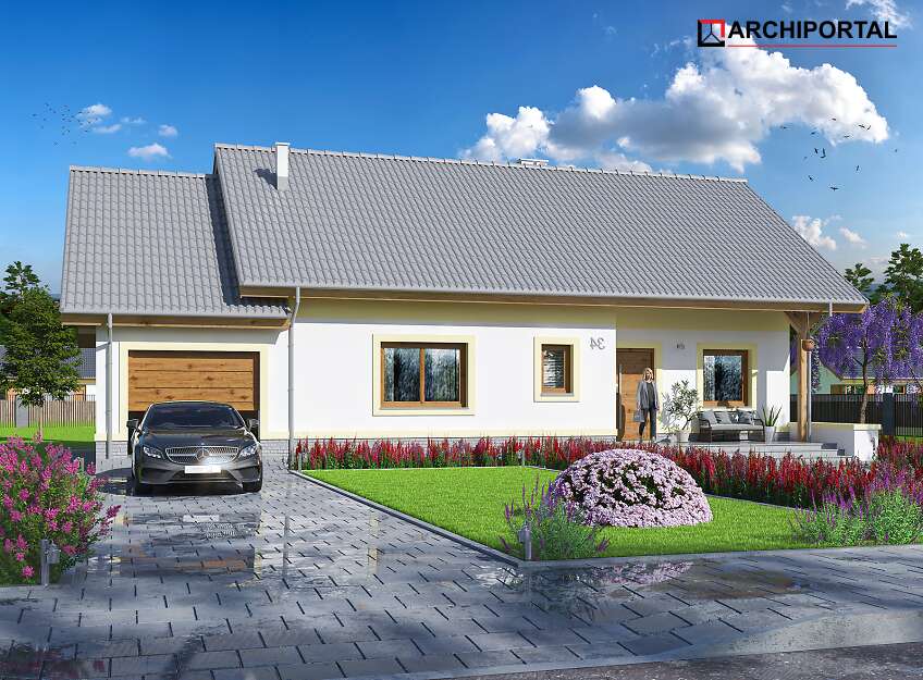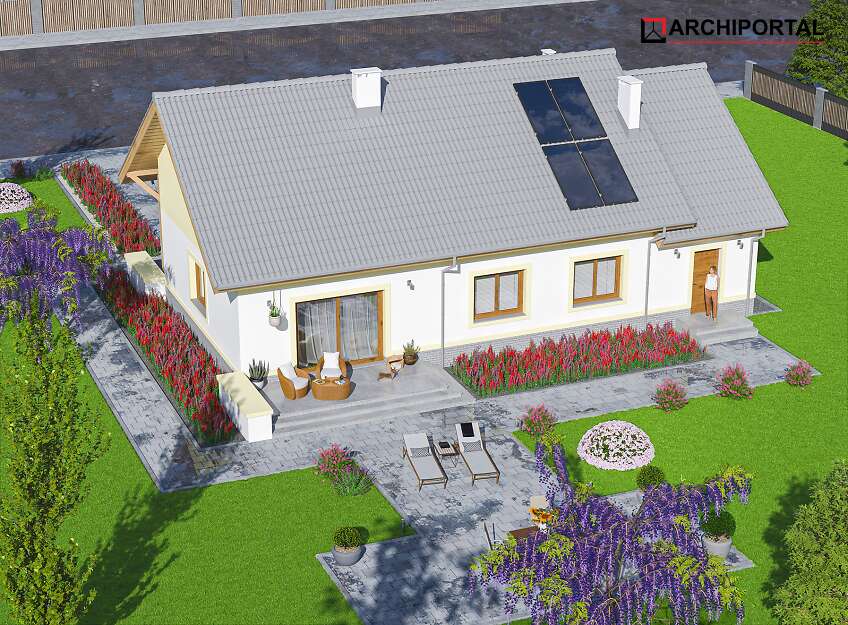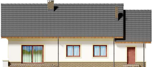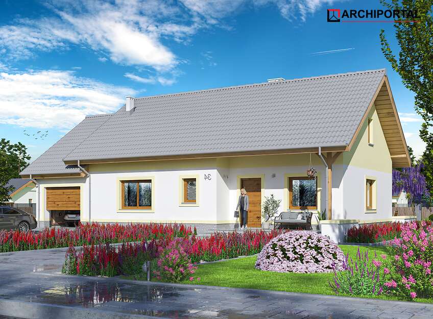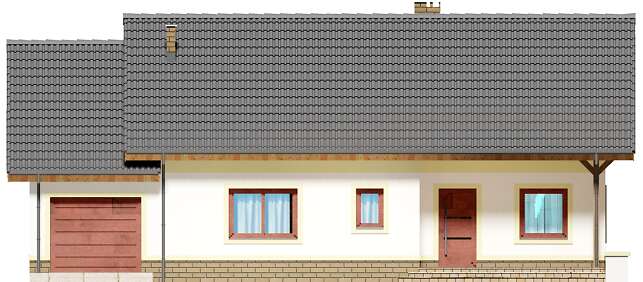 Mały, urokliwy dom parterowy z garażem i możliwością adaptacji poddasza. W budynku dużą uwagę poświęcono funkcjonalności wnętrz i maksymalnemu wykorzystaniu przestrzeni. Do dyspozycji mieszkańców są: duży, jasny salon, połączono z kuchnią, 3 ustawne pokoje, jeden z własną garderobą oraz przestronna łazienka z miejscem na wannę i prysznic. Do garażu przechodzimy przez praktyczne pomieszczenie gospodarcze, w którym wygospodarowano miejsce na pralkę. Za garażem znajduje się spora kotłownia, w której zaprojektowano dwa rodzaje ogrzewania: gazowe oraz na paliwo stałe – biomasę. Dokumentacja projektu zawiera rozwinięcia obydwu rodzajów instalacji, tak by to inwestor zdecydował, który z nich zastosuje w swoim domu, bez konieczności dodatkowych zmian na etapie adaptacji. W korytarzu domu zaprojektowano schody drewniane prowadzące na poddasze nieużytkowe, ich usytuowanie powoduje, że strych możemy zaadaptować na dodatkowe pomieszczenia mieszkalne, co jest dużym atutem budynku. Wysoka ścianka kolankowa poddasza sprawi natomiast, że pomieszczenia te będą bardzo wygodne w użytkowaniu. W budynku zaprojektowano strop Teriva. Dom ma tradycyjną, ponadczasową bryłę i zwraca uwagę ciekawym podcieniem wejściowym, jednocześnie jest prosty i tani w budowie, a także późniejszej eksploatacji. Zastosowano w nim tylko sprawdzone i trwałe rozwiązania.